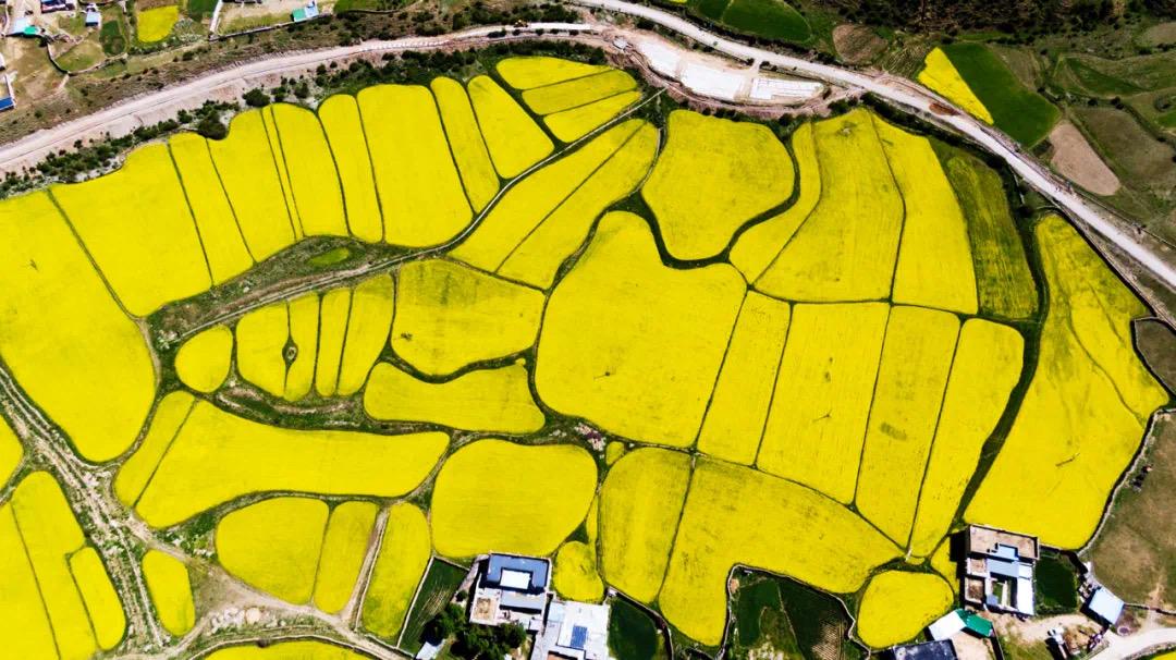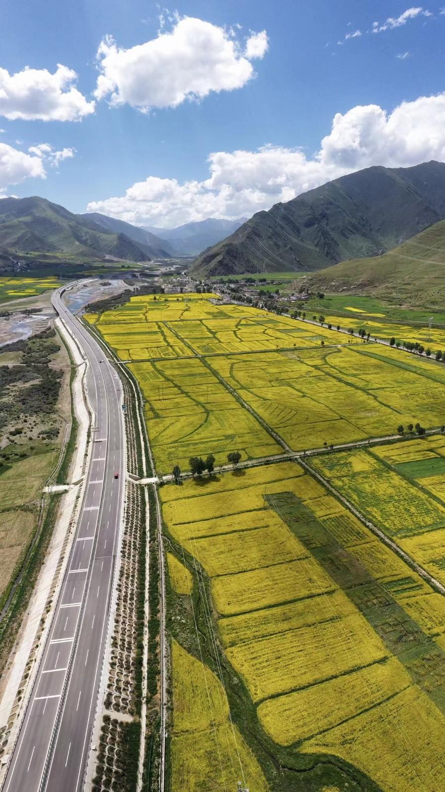 田间地头,成片的油菜花与蓝天白云交相辉映,广阔的油菜花丛中,蜜蜂、蝴蝶翩翩起舞。图为拉林高速旁的墨竹工卡油菜花。