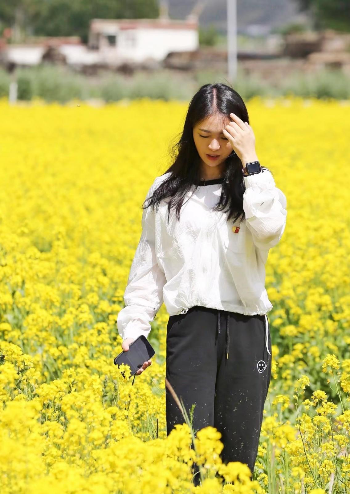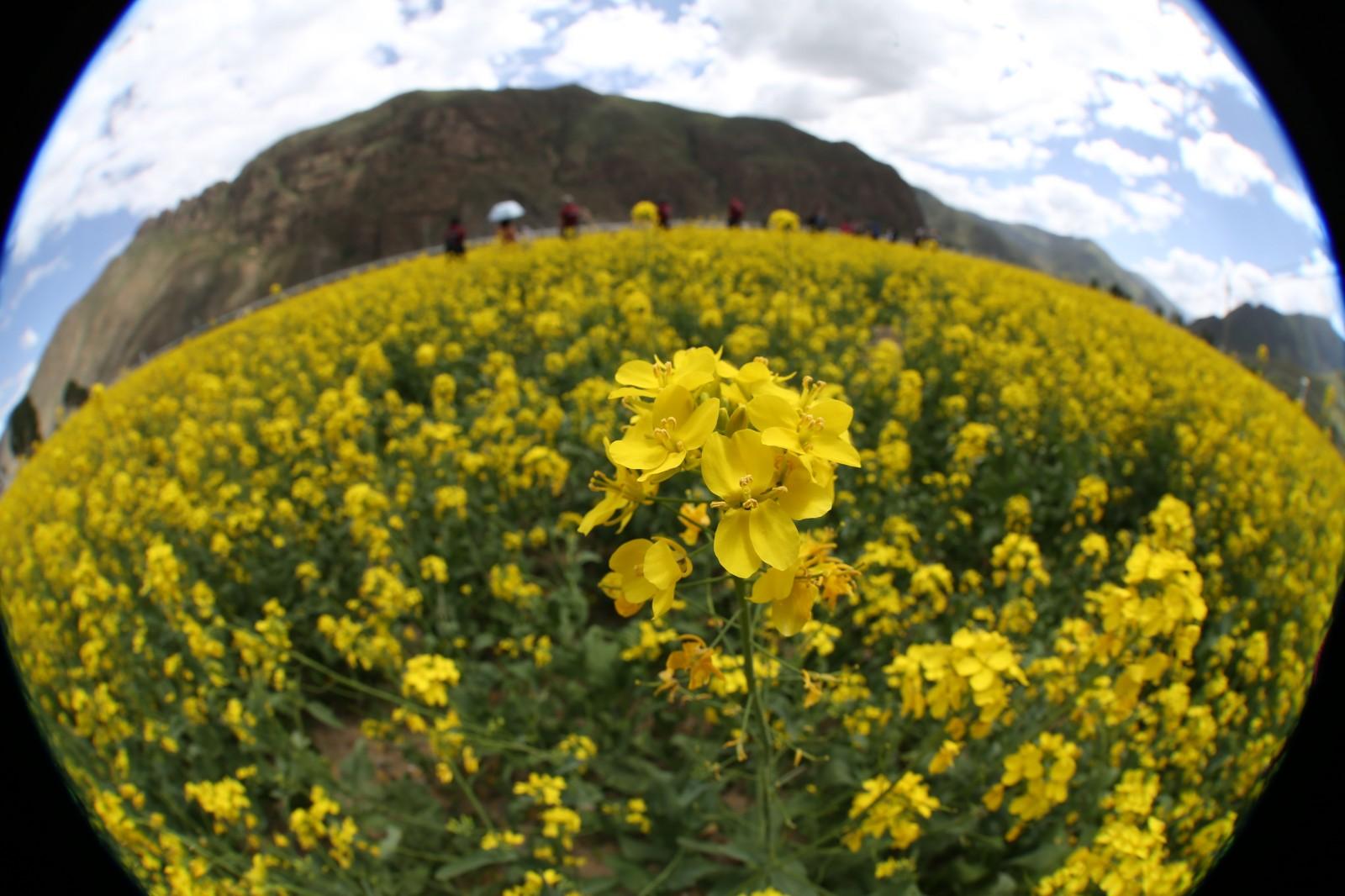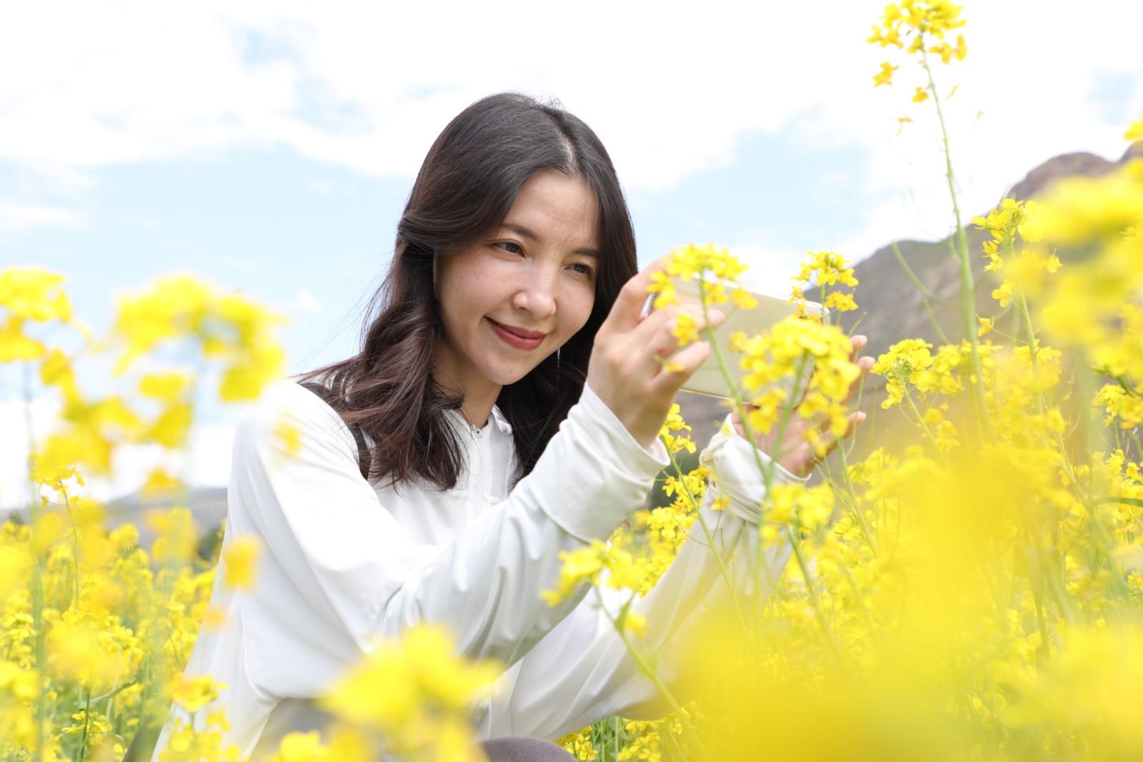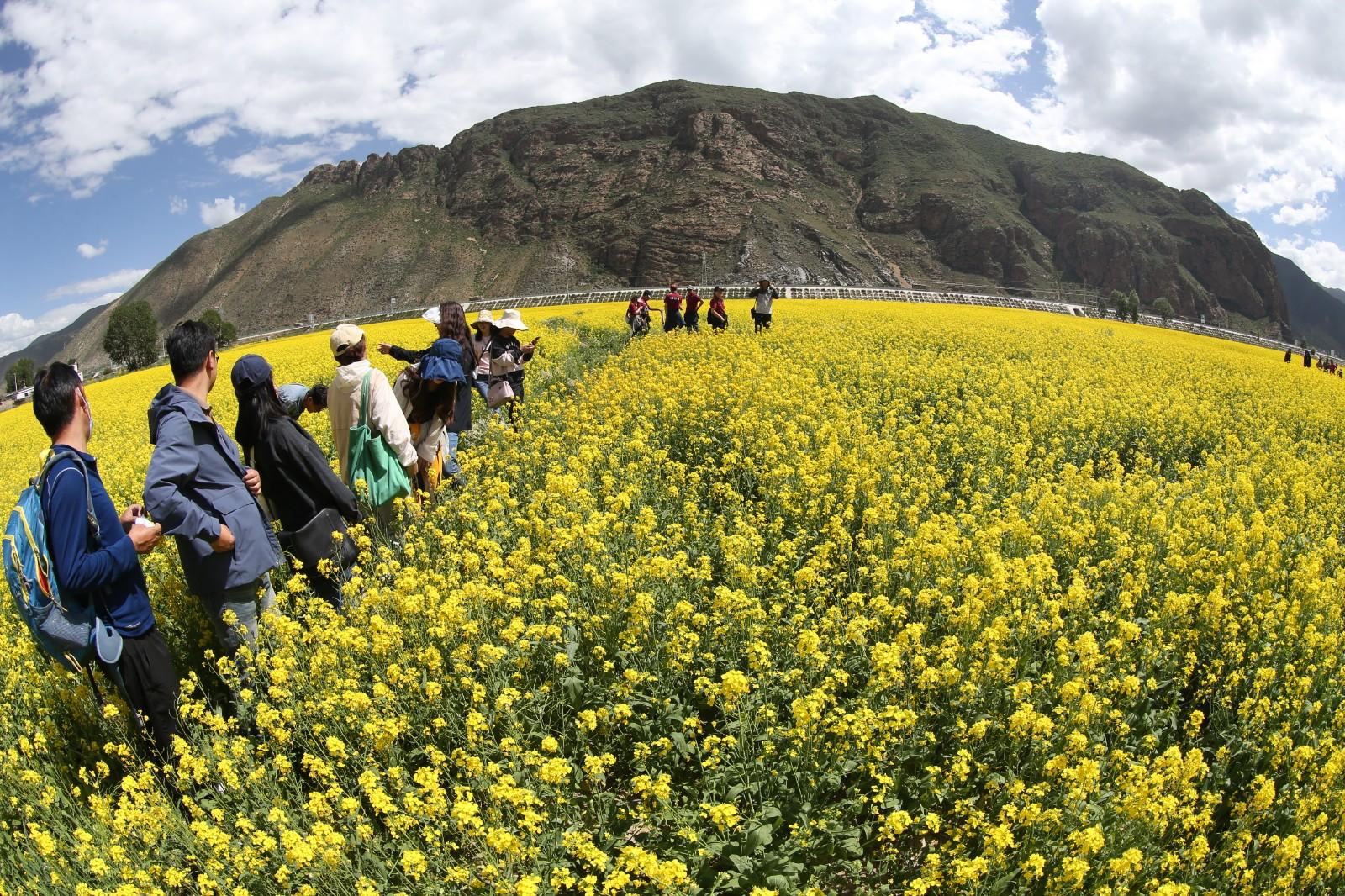 在这里,金黄的油菜花和翠绿的青稞相交融,织成了一幅幅美不胜收的美丽画卷,引来路人游客争相观赏。图为在田间赏花的游客。