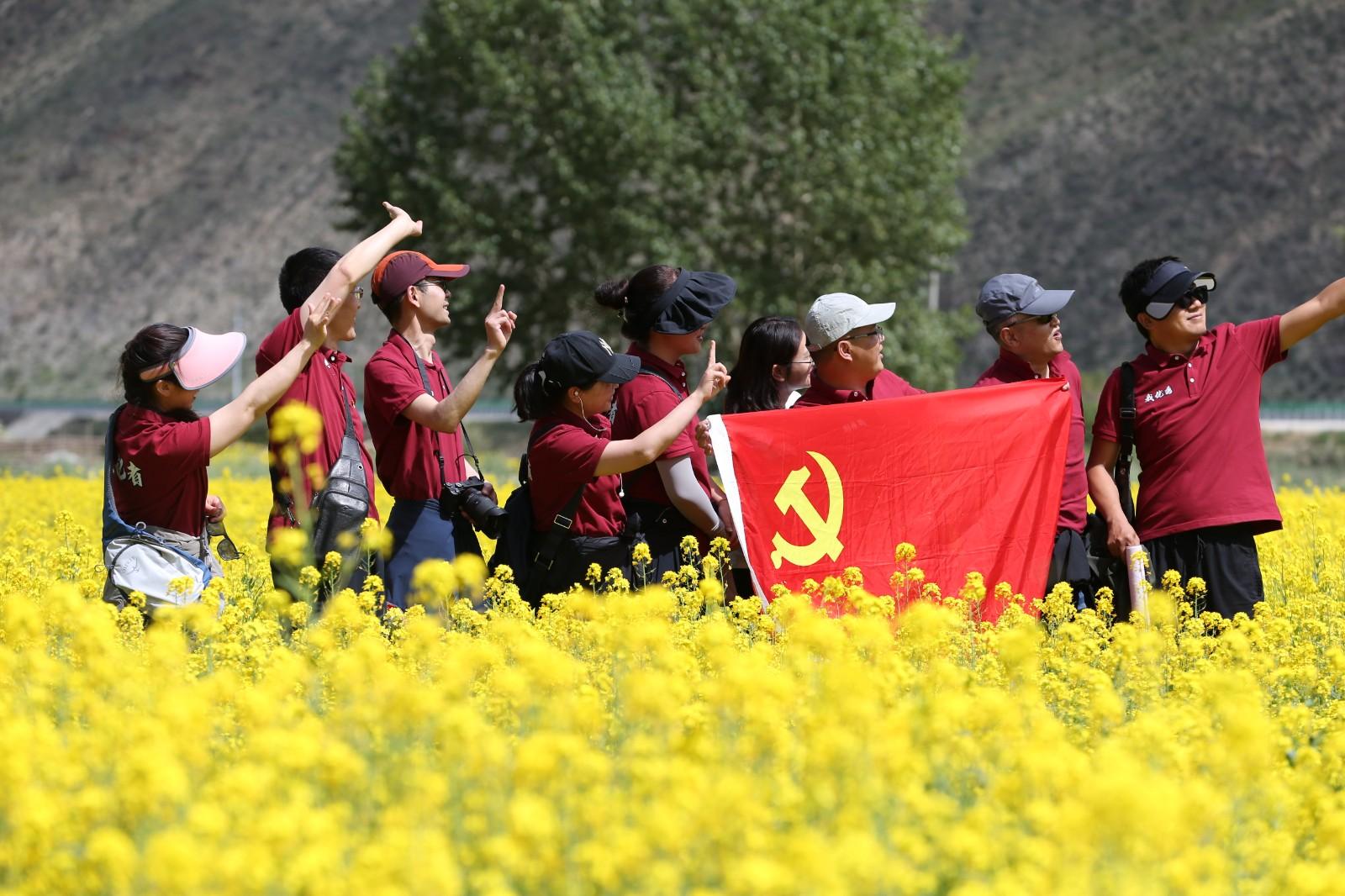 墨竹工卡县万亩油菜花海吸引的不仅仅是游客,也有进行党建活动的企事业、机关的党员。图为近日在扎西岗乡扎西岗村“喜迎二十大”油菜花图案旁开展主题党日活动并留影纪念的党员。