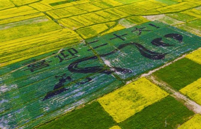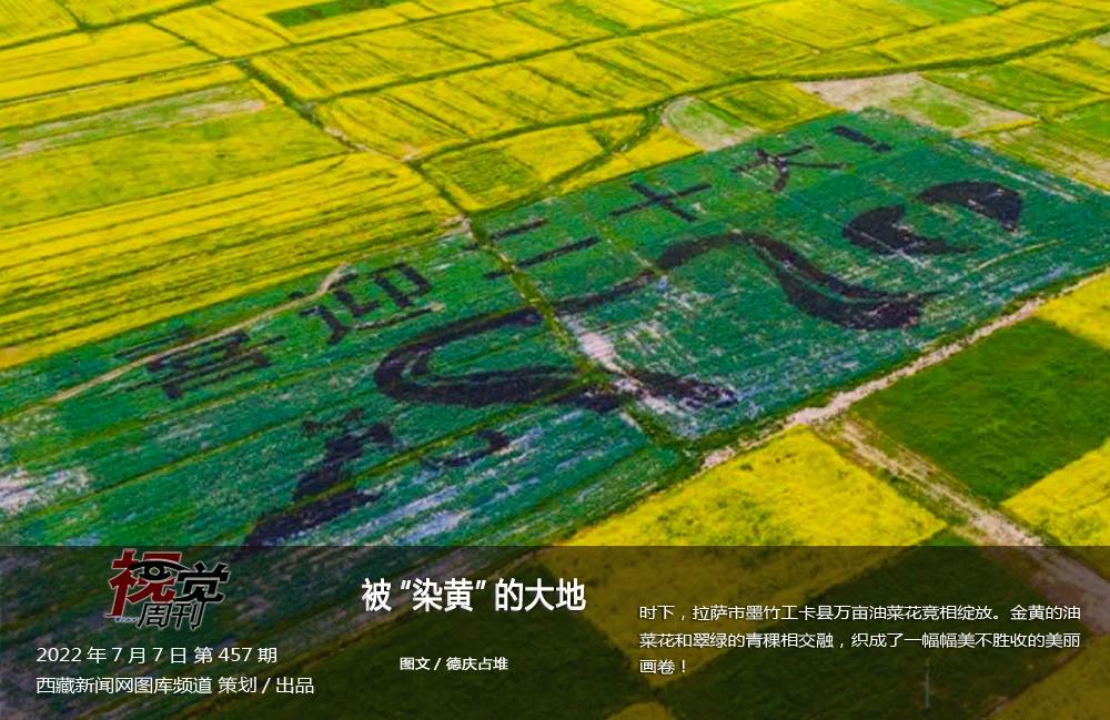 在墨竹工卡县扎西岗乡扎西岗村,村民种植了各类品种的油菜花,利用油菜花的颜色差异,精心绘制了“喜迎二十大”字样的图案。图为航拍油菜花组成的“喜迎二十大”图案。