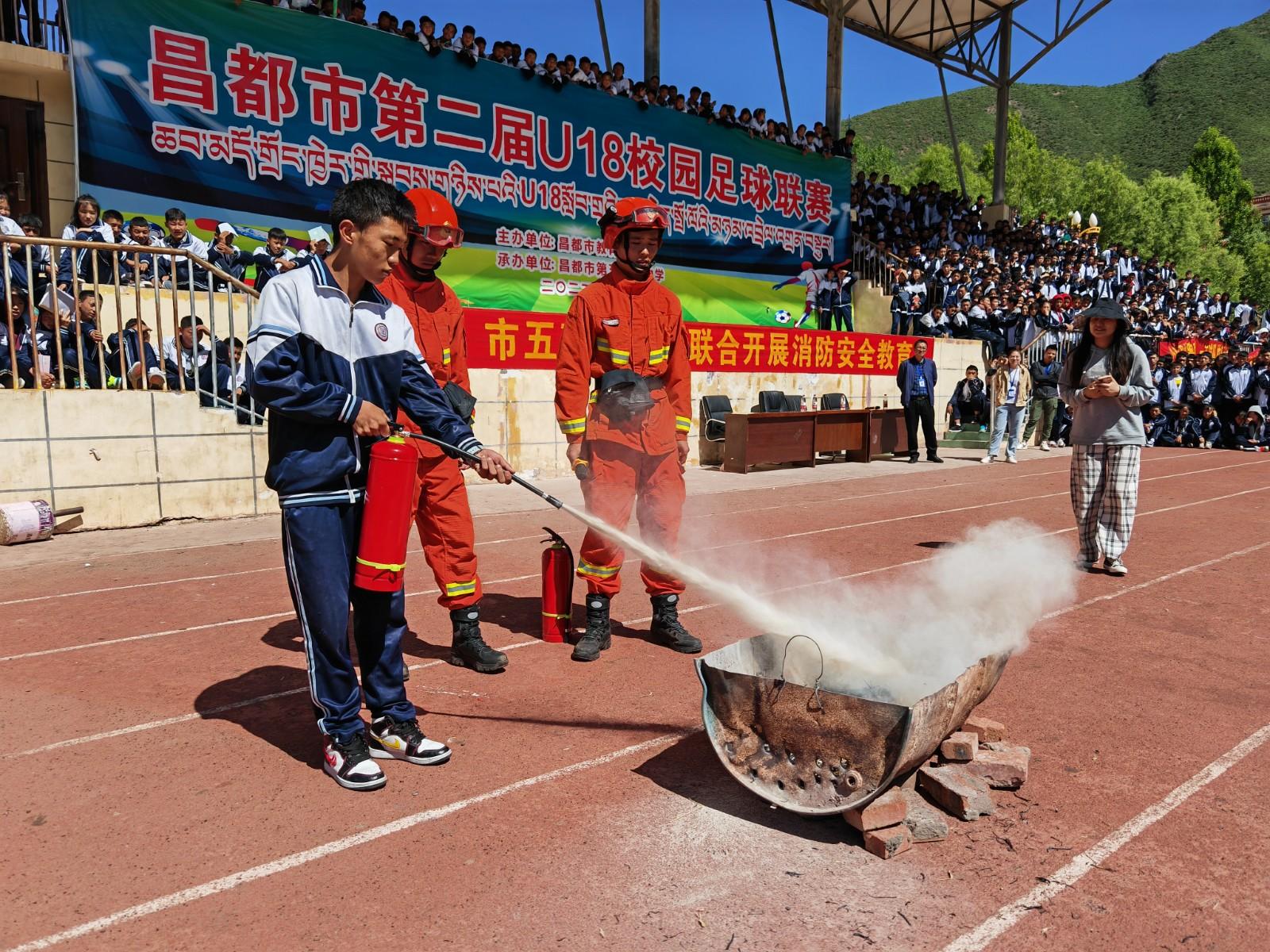 为进一步普及消防安全知识,最大限度减少灾害事故造成的损害,提高学校师生的消防安全意识,近日,昌都市森林消防支队卡若区中队前往昌都市第五、第六高级中学进行了消防安全教育。图为在消防员的指导下,学生体验灭火。 记者 桑邓旺姆 通讯员 邓珠平措 摄