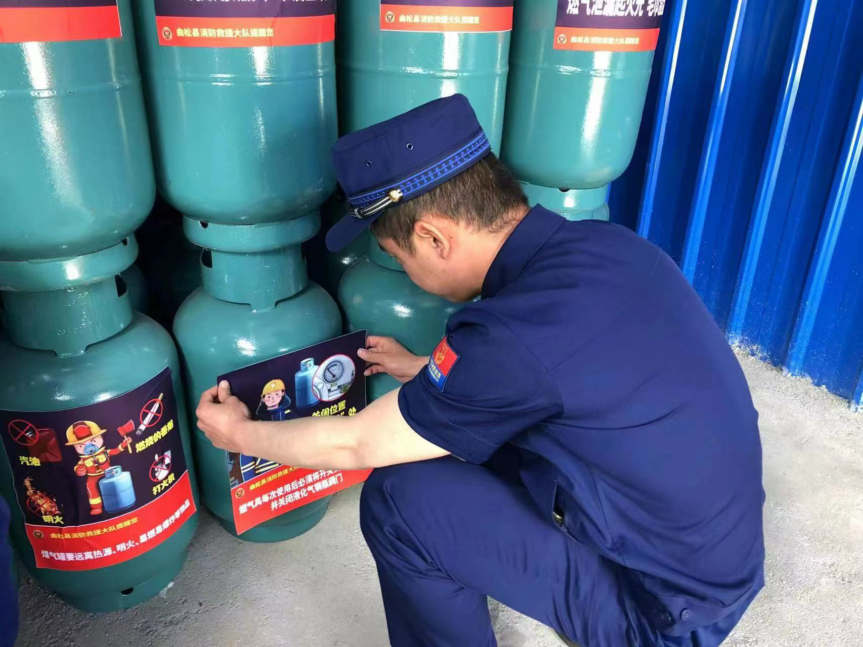 图为消防工作人员在曲松县液化气站粘贴警示标语。