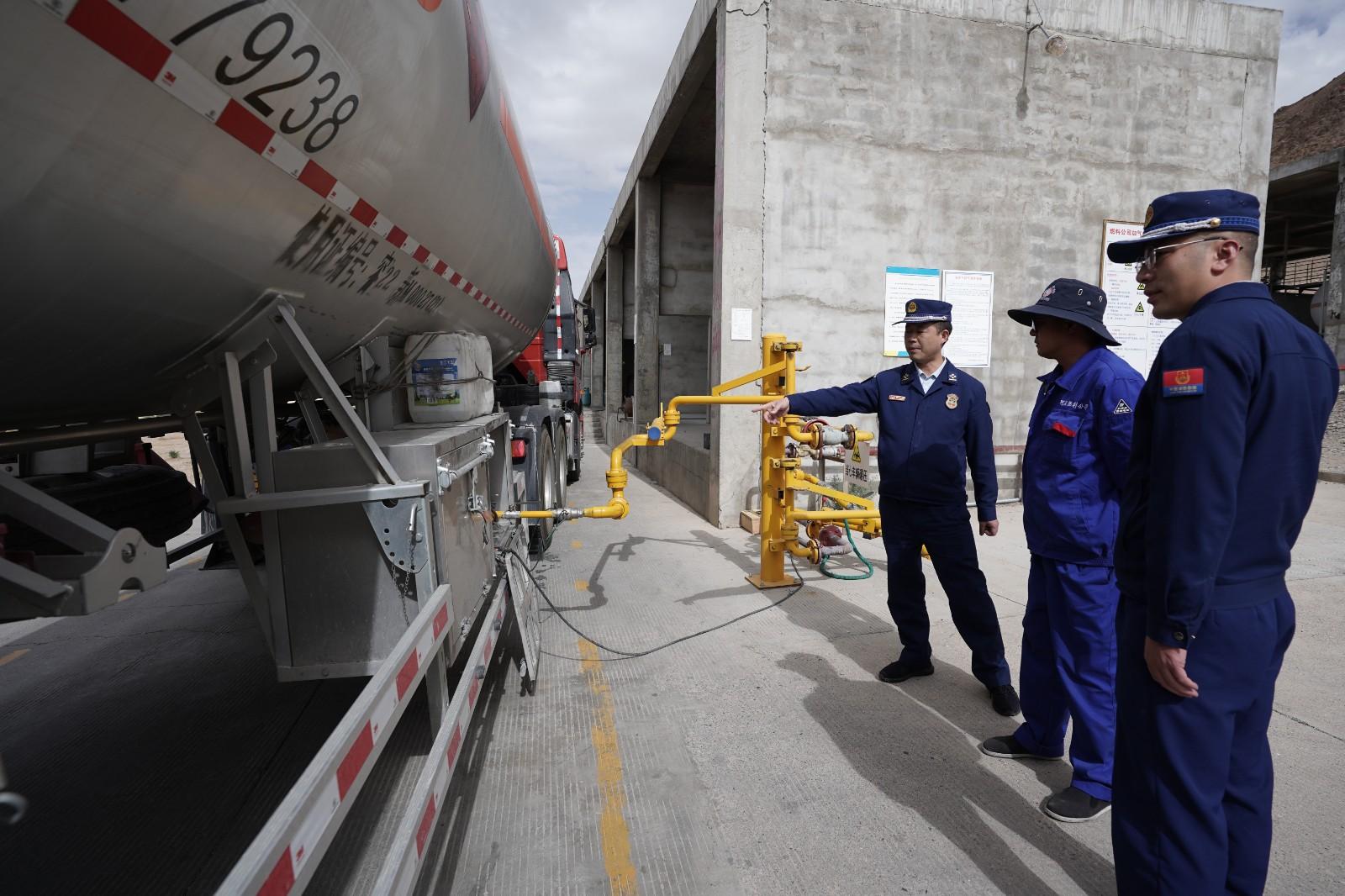 图为消防工作人员在阿里地区燃料公司液化气站讲解槽罐车运输、装卸相关事项。