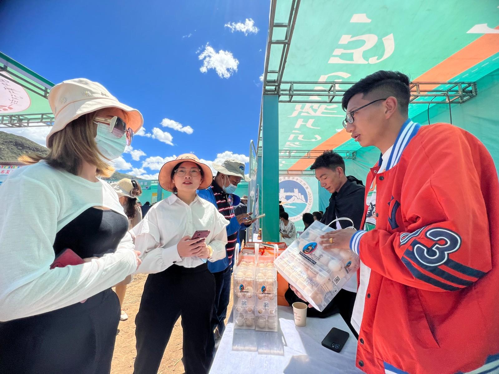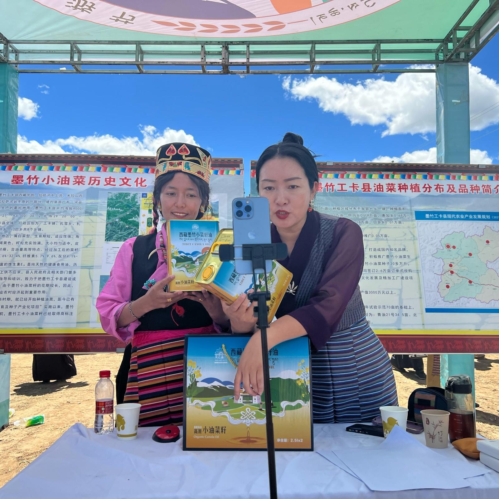 绿色生态游——海拔5013米的米拉山垭口是进入拉萨的“东大门”,也是318国道上海拔最高的垭口,雄伟的山势引得无数游客在此打卡。距离米拉山不远处的思金拉措仿佛是它的恋人,恬静秀美,偎依在群山怀抱中。“思金拉措”藏语意为“具有威力的神湖”,位于墨竹工卡县日多乡,海拔4500米,四周群峰簇拥,地形犹如聚宝盘。伫立湖边,极目远眺,平静的湖面像一块巨大的翡翠,闪烁着美丽的光泽,这里的彩虹道已经成为新的网红打卡地。图为小菜籽油电商销售现场。