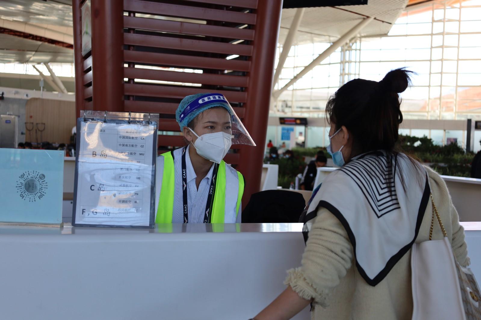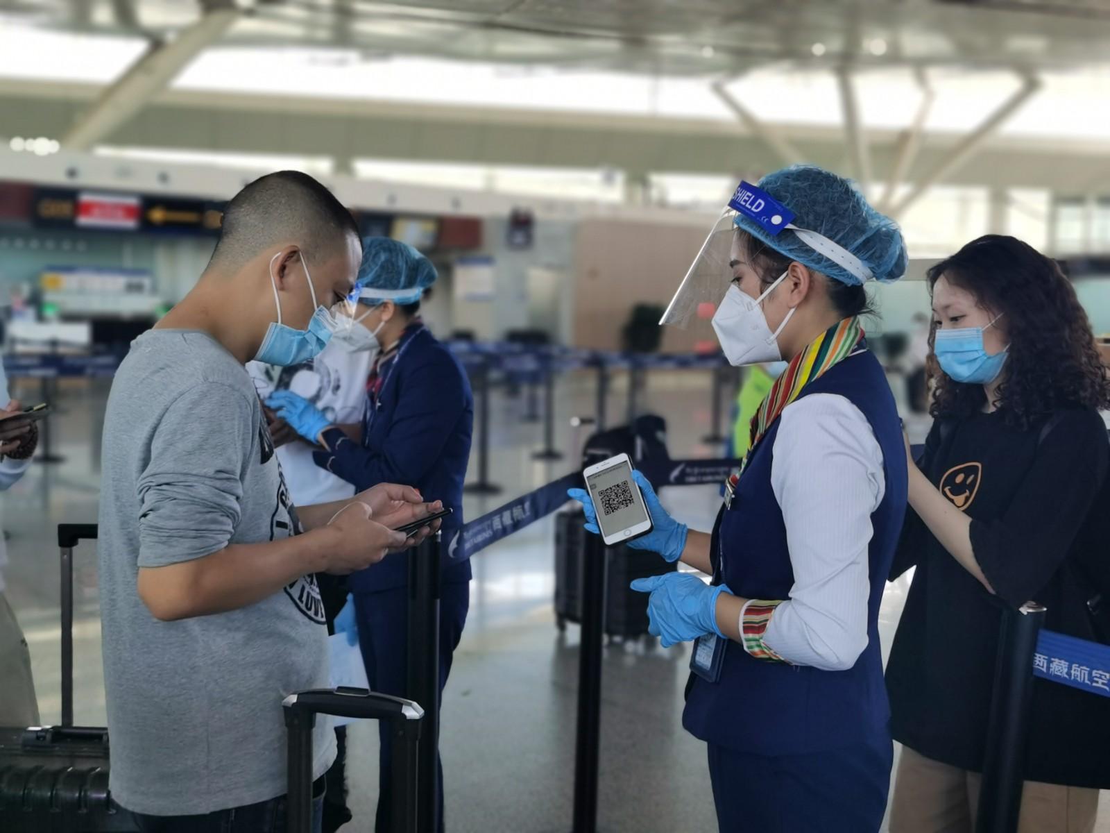 疫情发生后,拉萨贡嘎机场第一时间做出紧急部署,进一步强化航站楼疫情防控措施,加强员工疫情防控管理,全力保障旅客安全顺畅出行。 图为拉萨贡嘎机场工作人员引导旅客扫码登记。 记者 梁秦 摄