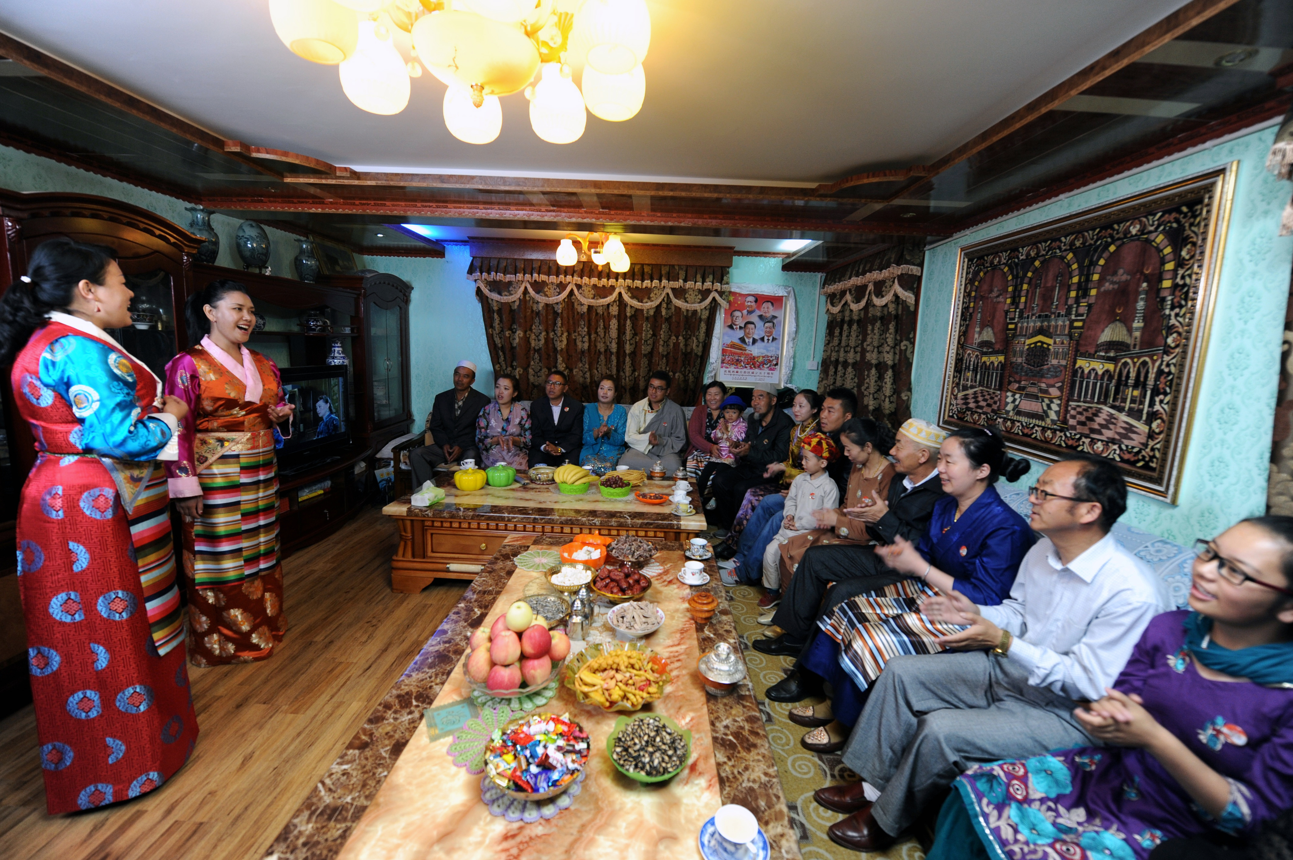 着力创建全国民族团结进步模范区。截至2022年5月,全区共有国务院、西藏自治区表彰的民族团结进步模范集体1934个,模范个人2846人。图为2021年2月13日,西藏自治区拉萨市吉崩岗社区各族群众在同一天共度农历新年和藏历新年。