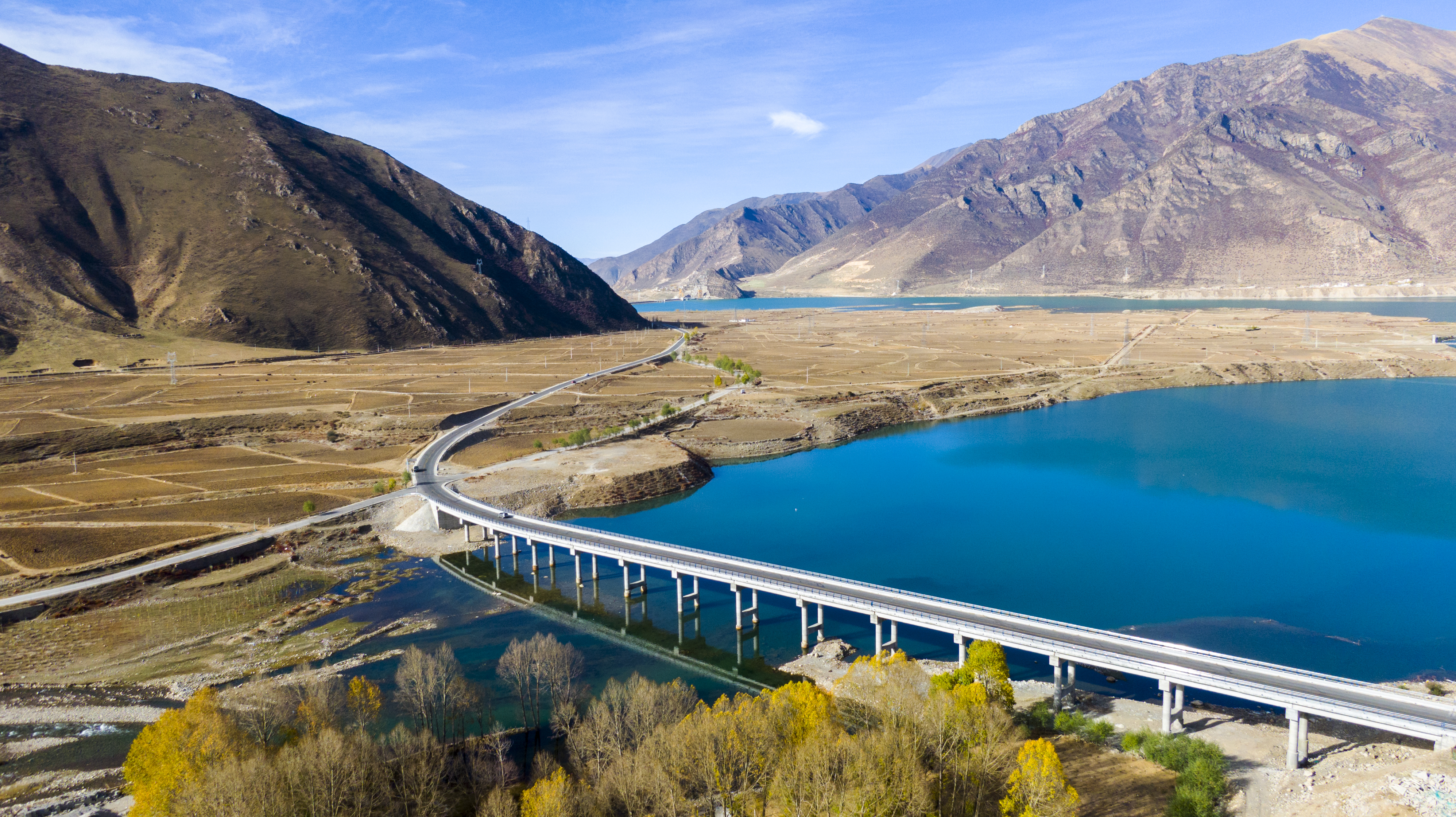 党的十八大以来,西藏交通运输事业取得巨大成就,形成了纵横交错、四通八达的综合交通运输网络。十年来,全区公路总里程由6.52万公里增至12.07万公里,高等级(高速)公路通车里程由38公里增至1105公里,以拉萨为中心的3小时综合交通圈正加快形成,拉林铁路建成投运,复兴号首次开上高原……一条条团结线、一条条幸福路,为我区经济社会发展提供了有力支撑。图为日前拍摄的349国道墨竹工卡县尼玛江热乡段高架桥。记者 潘多 通讯员 洛克 摄