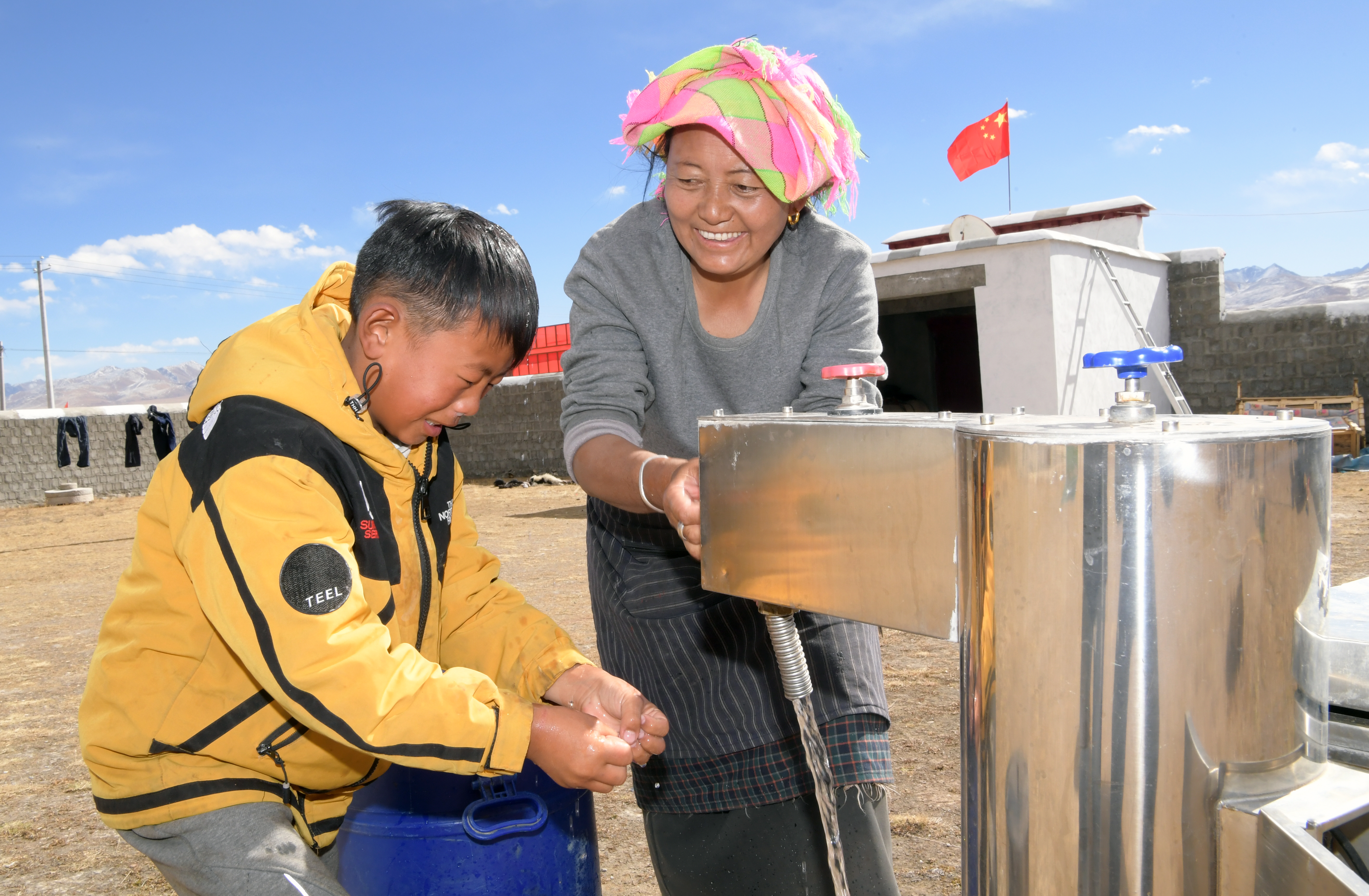近年来,随着西藏高海拔地区季节性饮水安全工程的实施,有效解决了高海拔地区季节性缺水问题,保障了农牧民群众冬季供水。拉萨市当雄县总投资8759.23万元,共修建459处农村饮水安全工程点,累计解决7546户53135人的饮水安全问题。图为近日,当雄县公塘乡冲嘎村一组村民拉宗母子在自家院子里用上了干净、放心的自来水。记者 洛桑 摄