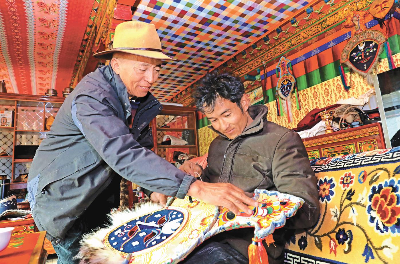 非物质文化遗产是重要的文化资源。近年来,我区始终坚持保护为主、抢救第一、合理利用、传承发展的方针,以建设重要的中华民族特色文化保护地为目标,全力推进非物质文化遗产的抢救、保护、传承和发展工作,取得显著成效。图为拉萨市非物质文化遗产传承人、墨竹工卡县达普林耐传统服饰制作技艺第五代传承人加措(左)向徒弟教授面具制作技艺。记者 潘多 摄
