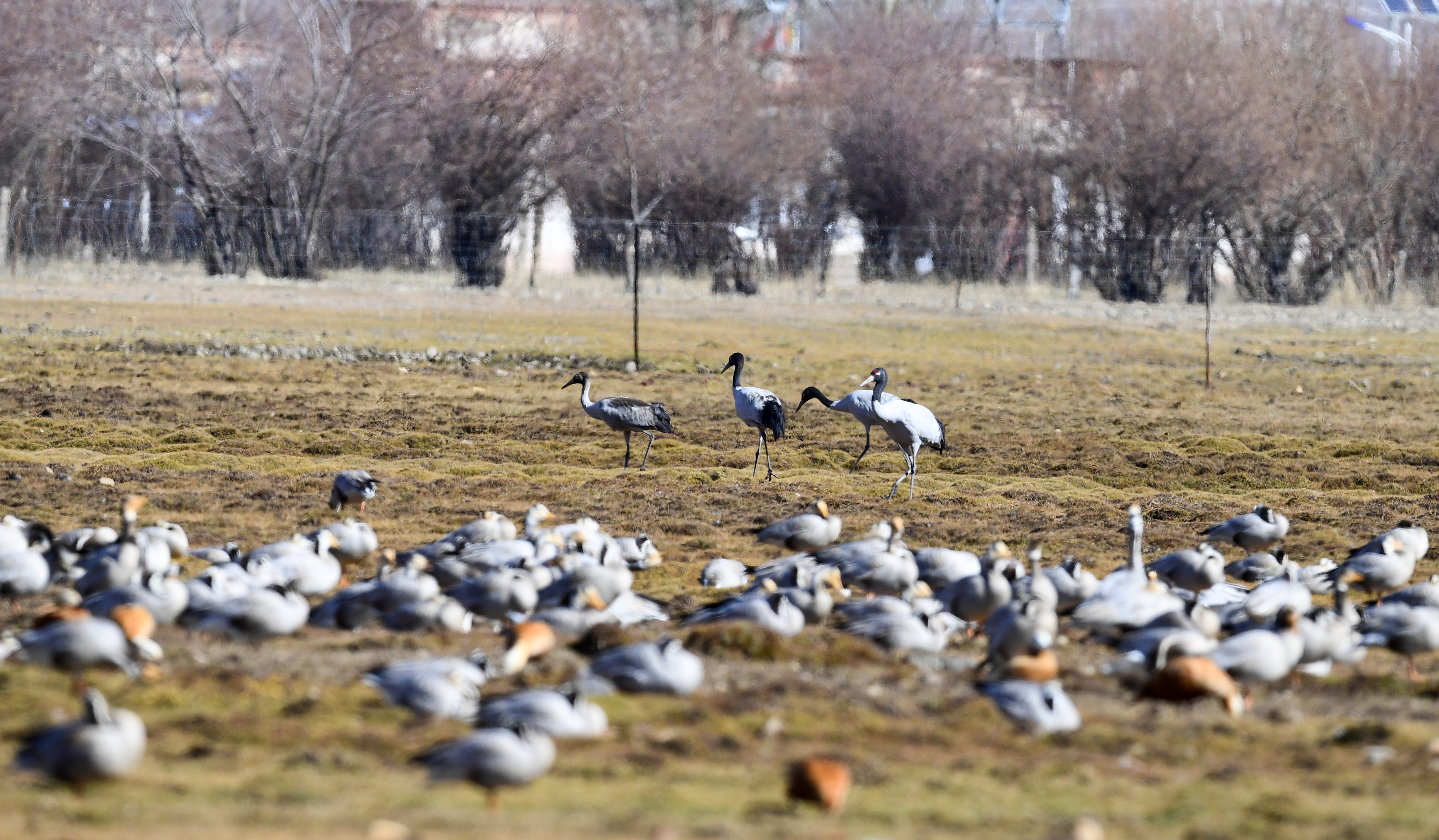 近年来,西藏多措并举实施生态建设工程,黑颈鹤数量逐年递增,目前西藏黑颈鹤数量超过万只,每年到拉萨市林周县越冬的黑颈鹤有2000只左右。图为11月16日在林周县境内越冬的黑颈鹤。记者 潘多 摄