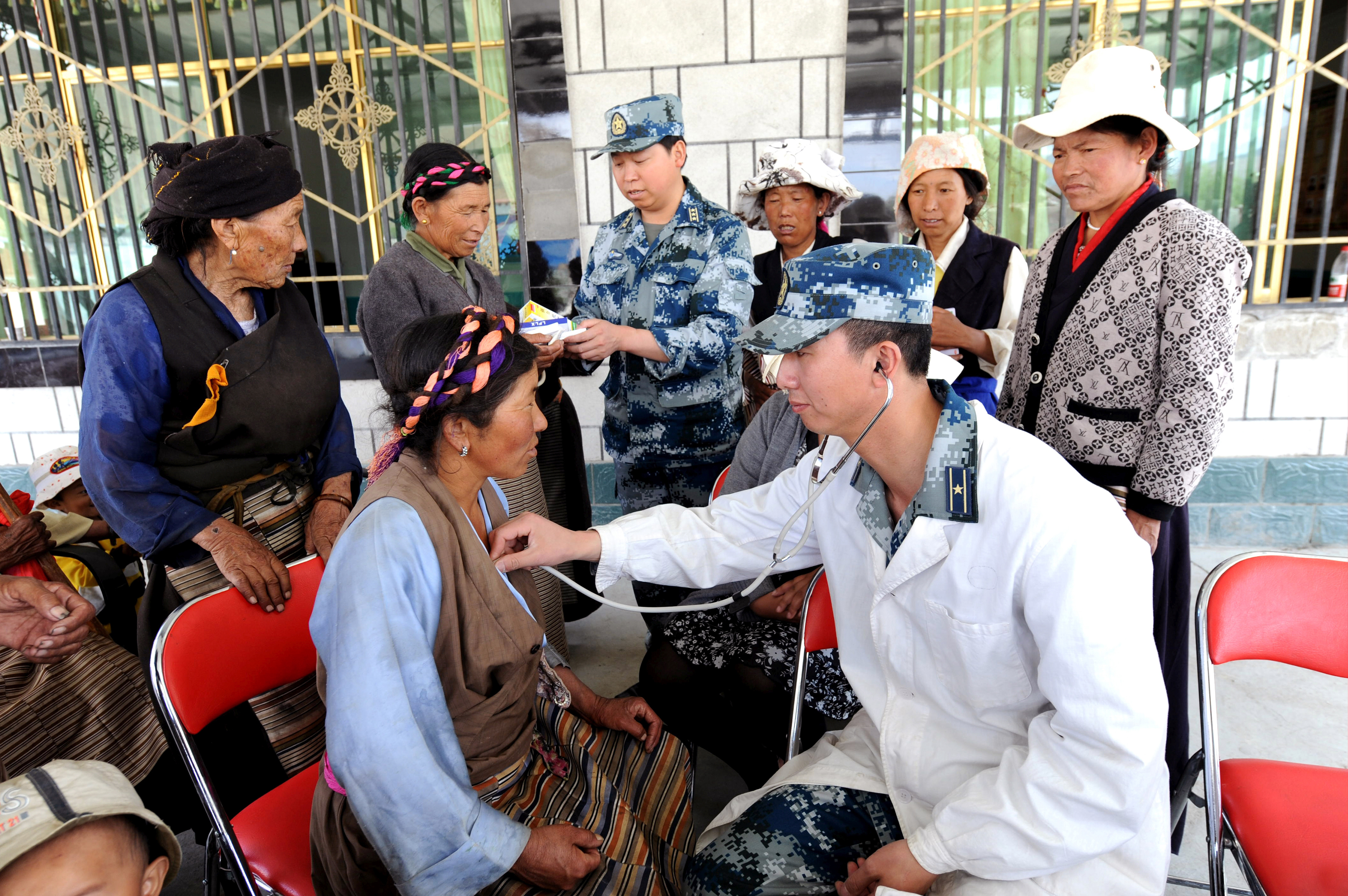军爱民、民拥军,军民团结一家亲。图为驻藏某部官兵为当地群众义诊。