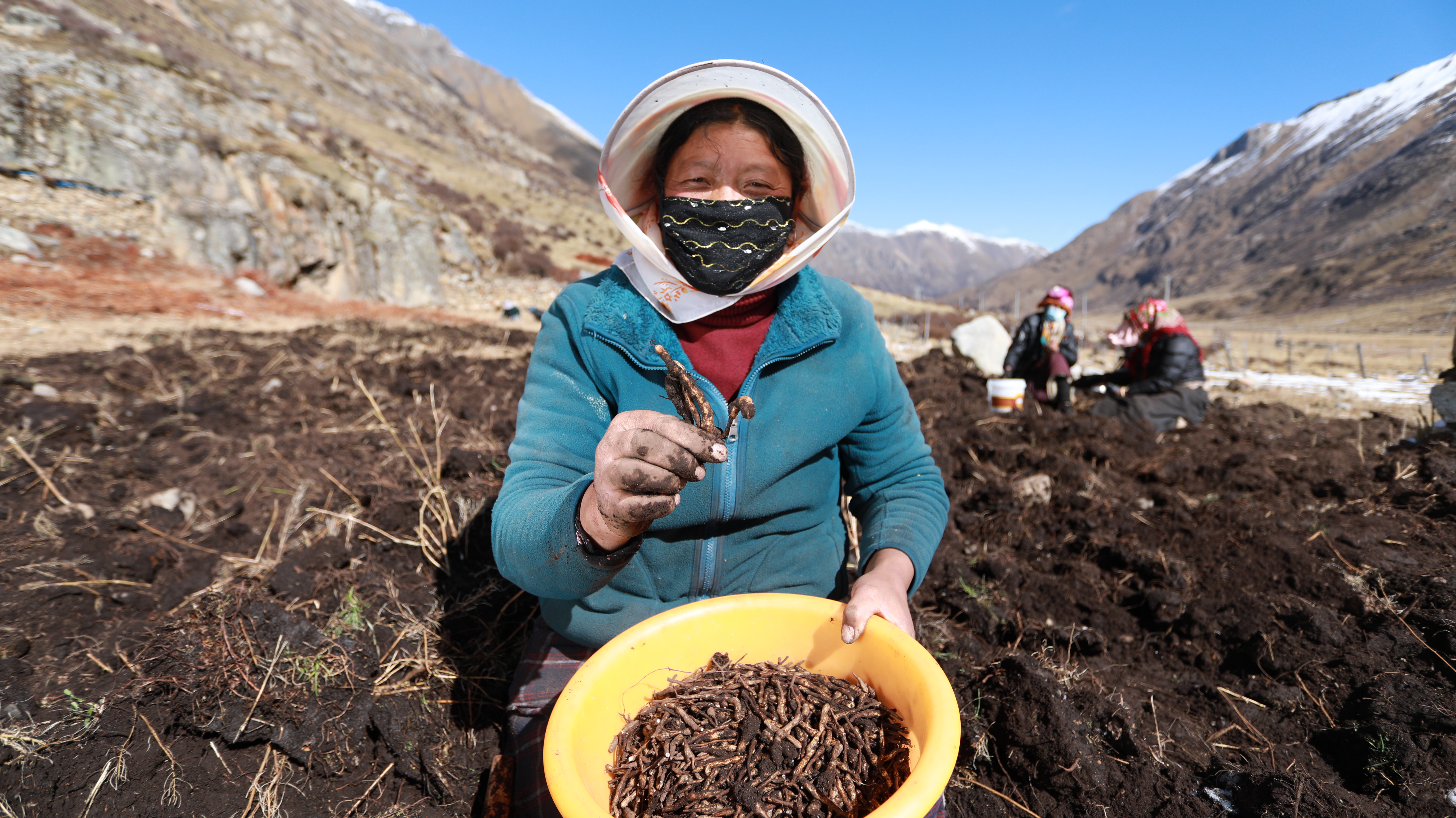近年来,那曲市嘉黎县多措并举拓宽农畜产品销售渠道,助力特色产业发展。嘉黎县人参果被越来越多的人所熟知,采挖销售人参果成了当地农牧民群众增收致富的重要渠道。图为嘉黎县阿扎镇群众展示采挖的人参果。索朗 记者 万靖 摄