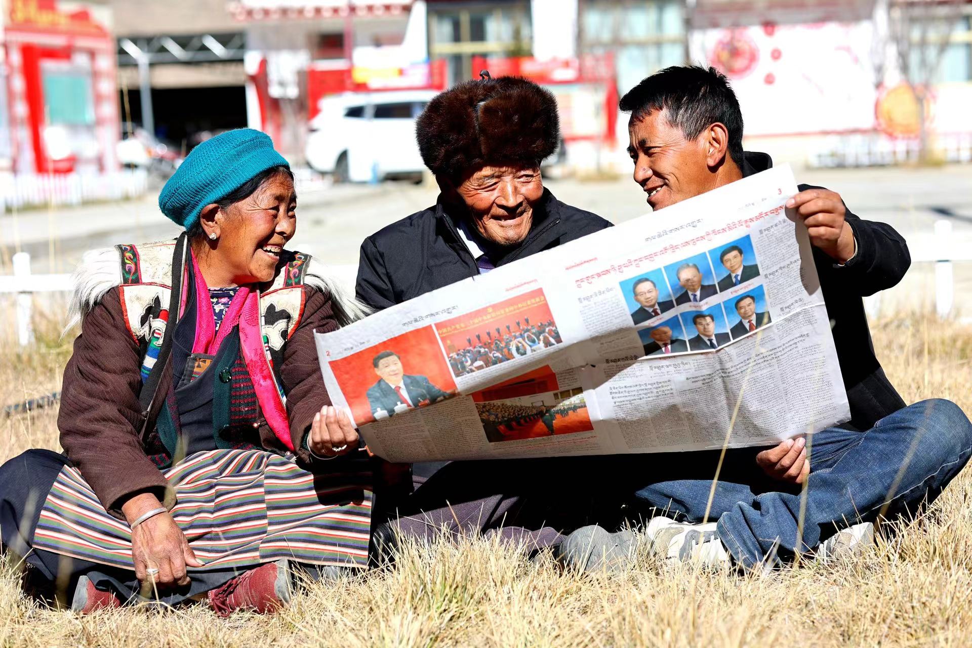 西藏各地组织宣讲员深入基层,通过群众喜闻乐见的方式,把党的二十大精神讲解给农牧民群众,进一步坚定大家听党话、感党恩、跟党走的信心和决心。图为琼结县琼结镇白日社区宣讲员普布扎西(右)在向群众宣讲党的二十大精神。通讯员 泽仁伦珠 记者 次旺 摄