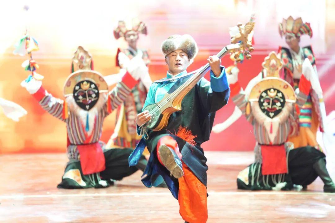 日前,日喀则市南木林县举办“礼赞二十大 建功新时代”为主题的“我们的节日·2023年春节藏历新年”联欢晚会,用鲜明的主题、精彩的作品、丰富的载体,深入推动党的二十大精神入脑入心。全县干部职工、离退休干部以及农牧民群众代表等300余人观看了晚会。图为演员们展示传统民族乐器演奏与歌舞元素相融合的独特文化魅力。德吉卓嘎 记者 汪纯 摄