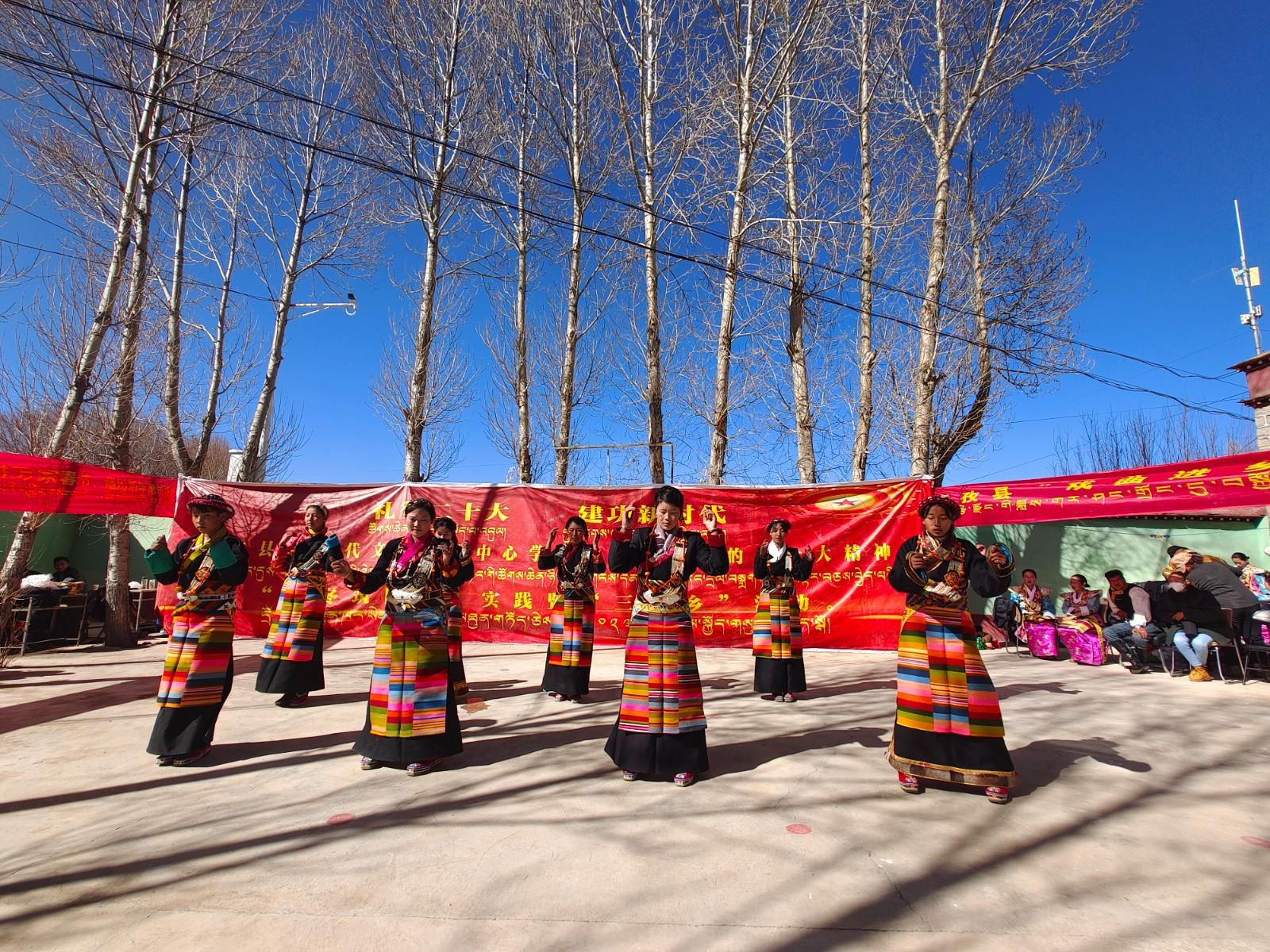 近日,“礼赞二十大 建功新时代”江孜县新时代文明实践学习宣传贯彻党的二十大精神之“暖冬筑同心”暨2023年“三下乡”活动先后在19个乡镇开展,为群众送上暖人的精神文化大餐。图为江孜县紫金乡帮玉村文艺演出队在表演文艺节目。