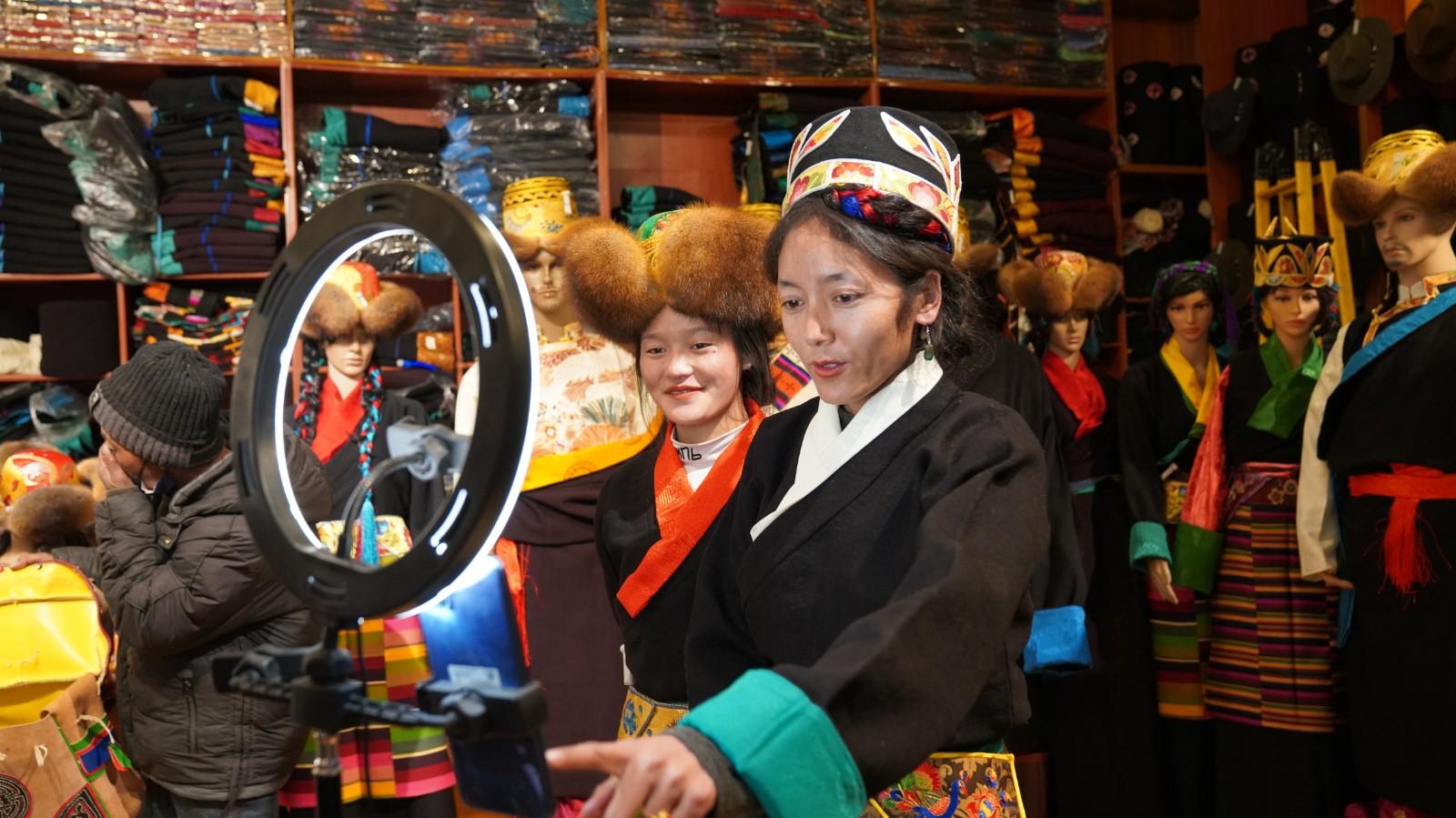 图为墨竹工卡宗穆厦传统艺术品加工有限公司员工通过直播销售民族服饰。记者 唐斌 通讯员 洛克 摄