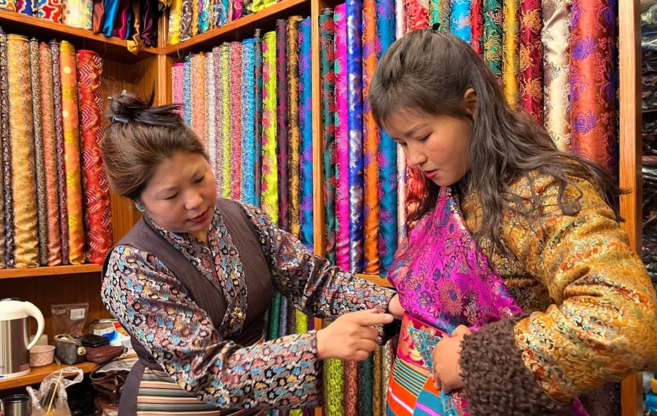 除了置办各类年货,大多数藏族群众都会选择定制一套新款藏装,从大家熟知的措美林藏装一条街到分布在大街小巷的各类大小规模不一的藏装店,都迎来了藏装定制热潮,各类布料琳琅满目、颜色绚丽,店员们给顾客们选布料、量尺寸、介绍款式,忙得不可开交。图为拉萨市民在藏装店里试穿藏装。 记者 旦增兰泽 摄