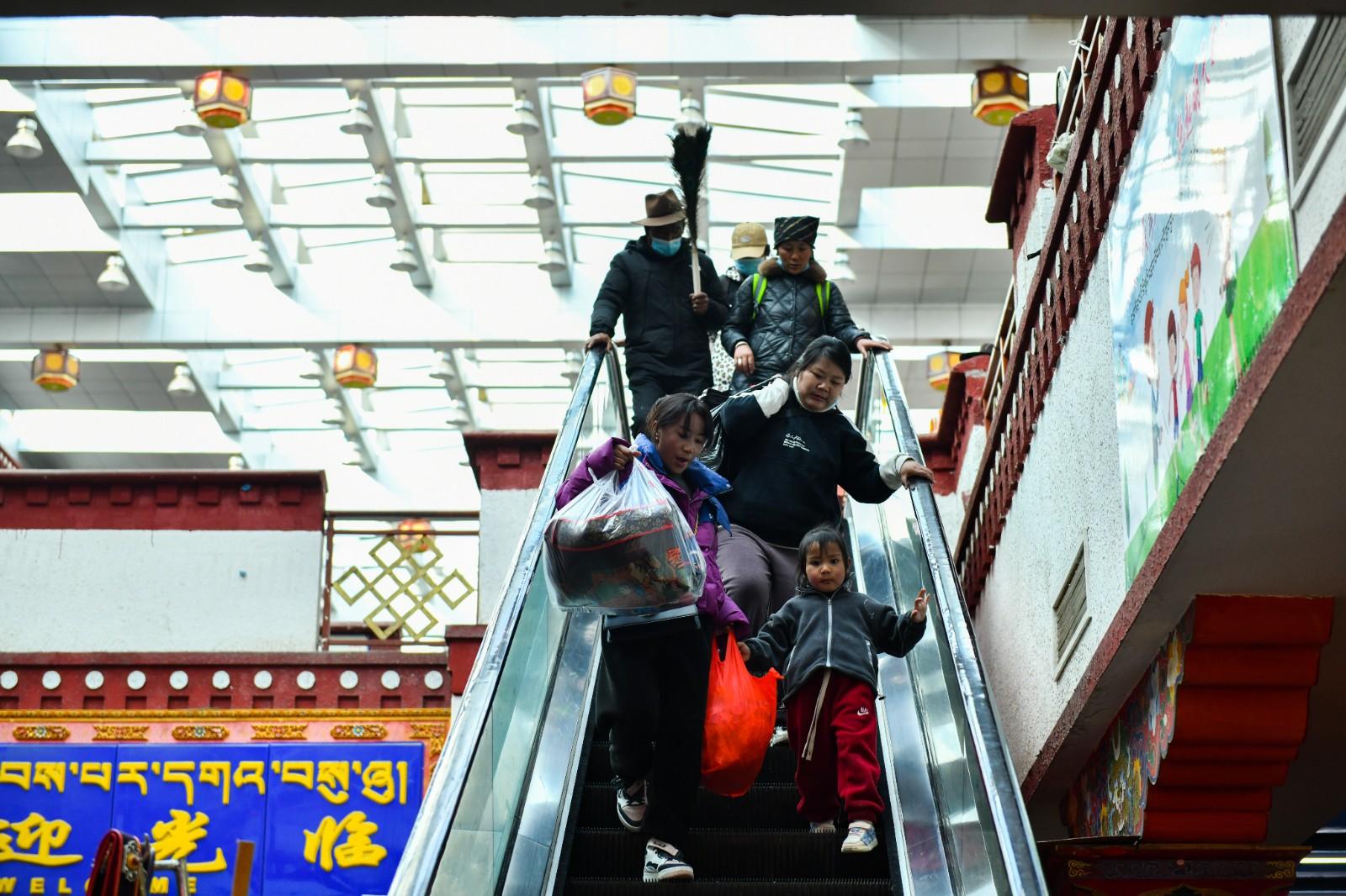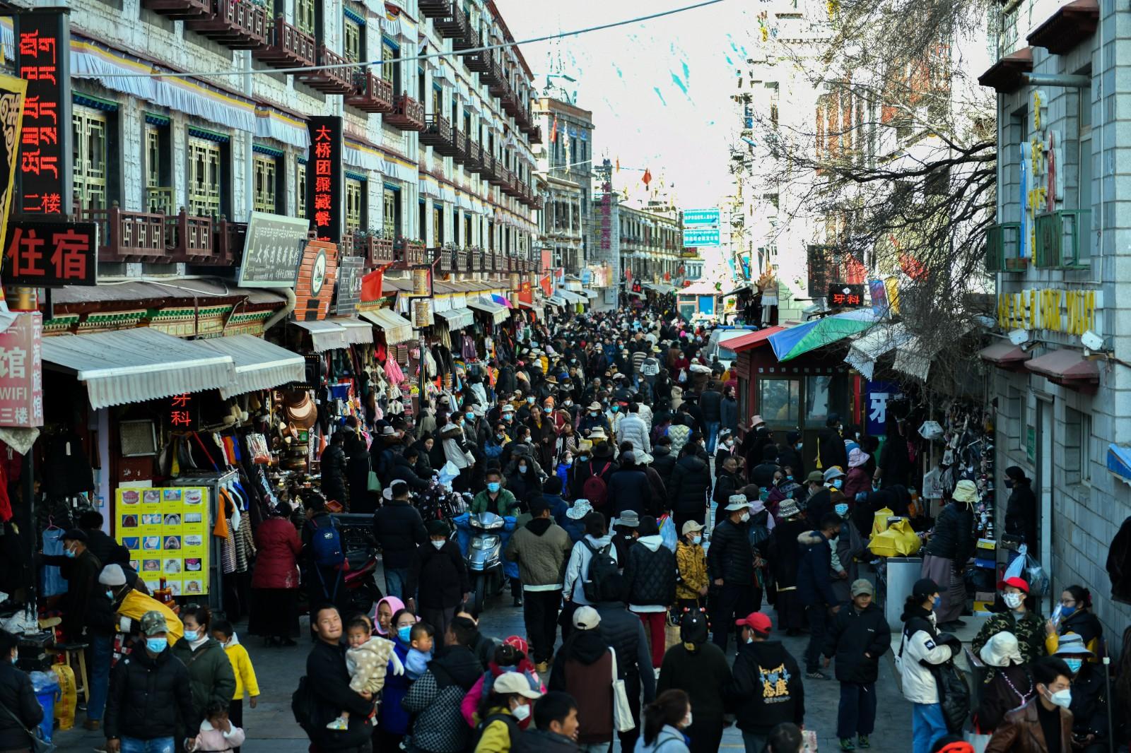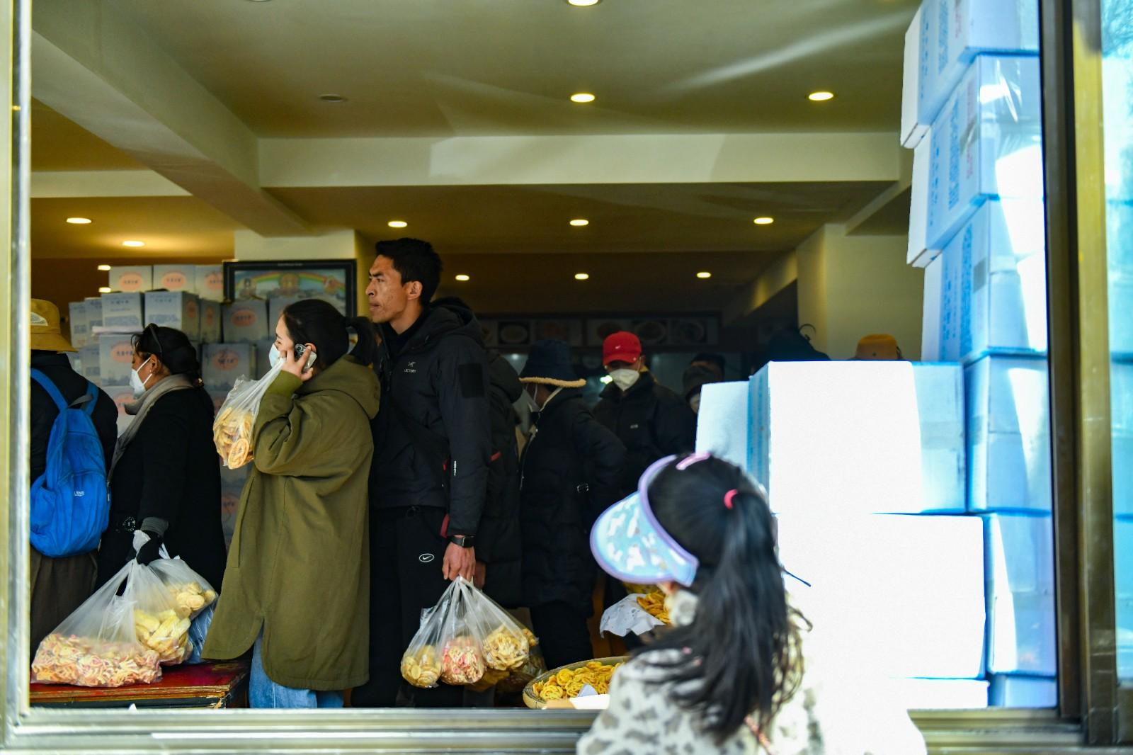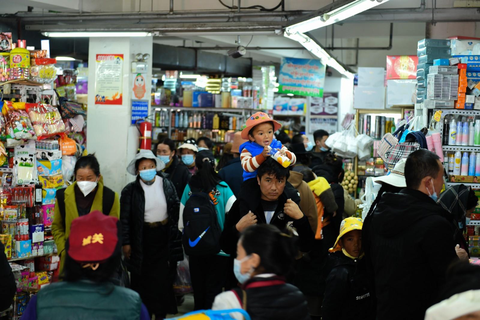 2023年藏历水兔新年临近,拉萨的各大年货市场人流如织、摩肩接踵,格外热闹。图为小昭寺附近的购物街里,前来为过年采买年货的人们穿梭在各家店铺中。记者 梁秦 摄