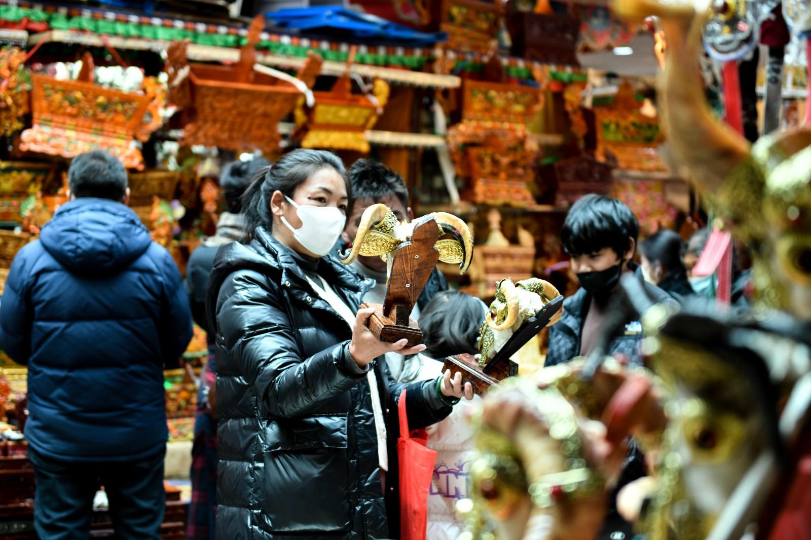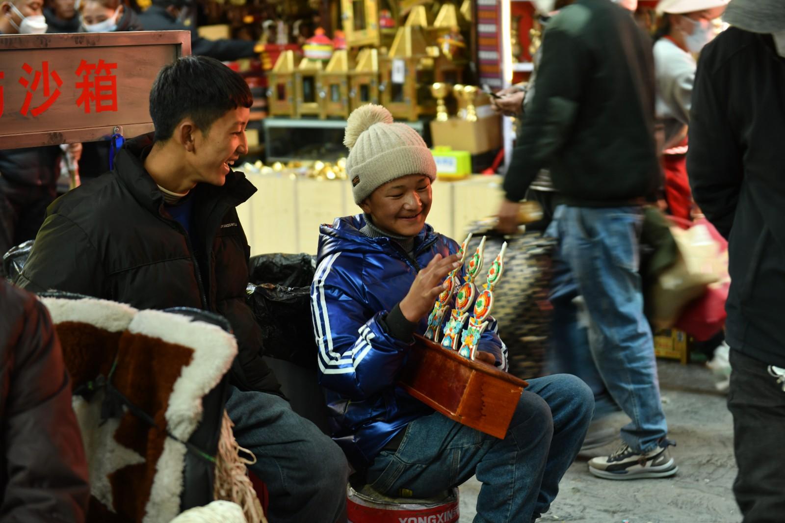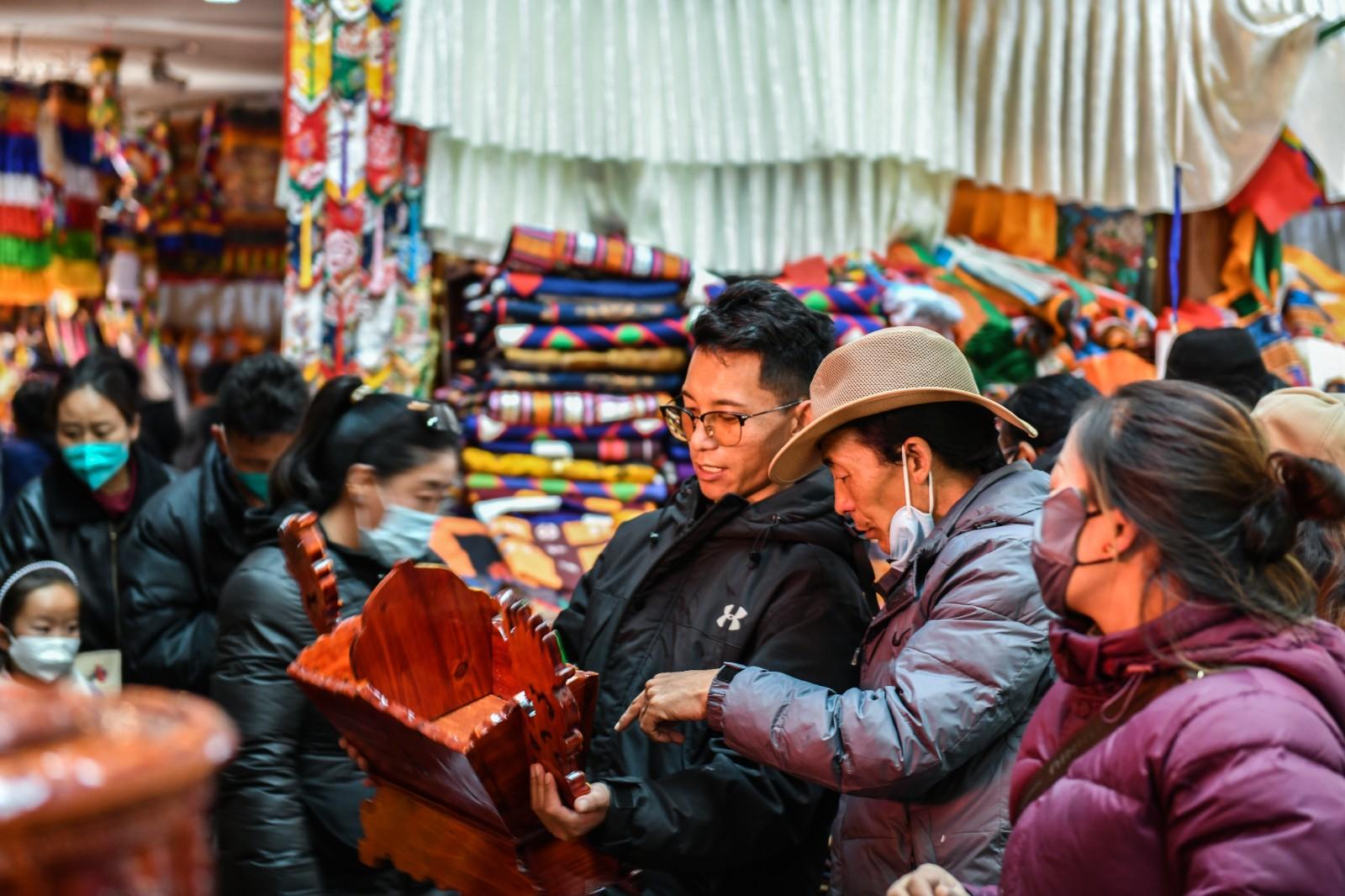 近年来,随着经济的发展,人们的过年方式也在悄然改变,越来越多的人选择利用假期,与家人、朋友去旅游,体验别样的年味。临近2023年藏历水兔年,许多游客趁着“冬游西藏”优惠政策来西藏过年,体验雪域高原冬季呈现的美丽和独特的人文风情。图为来自浙江杭州的游客在拉萨街头感受年货市场的热闹。记者 梁秦 摄