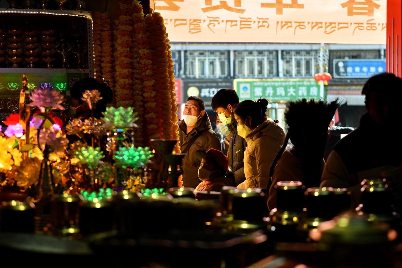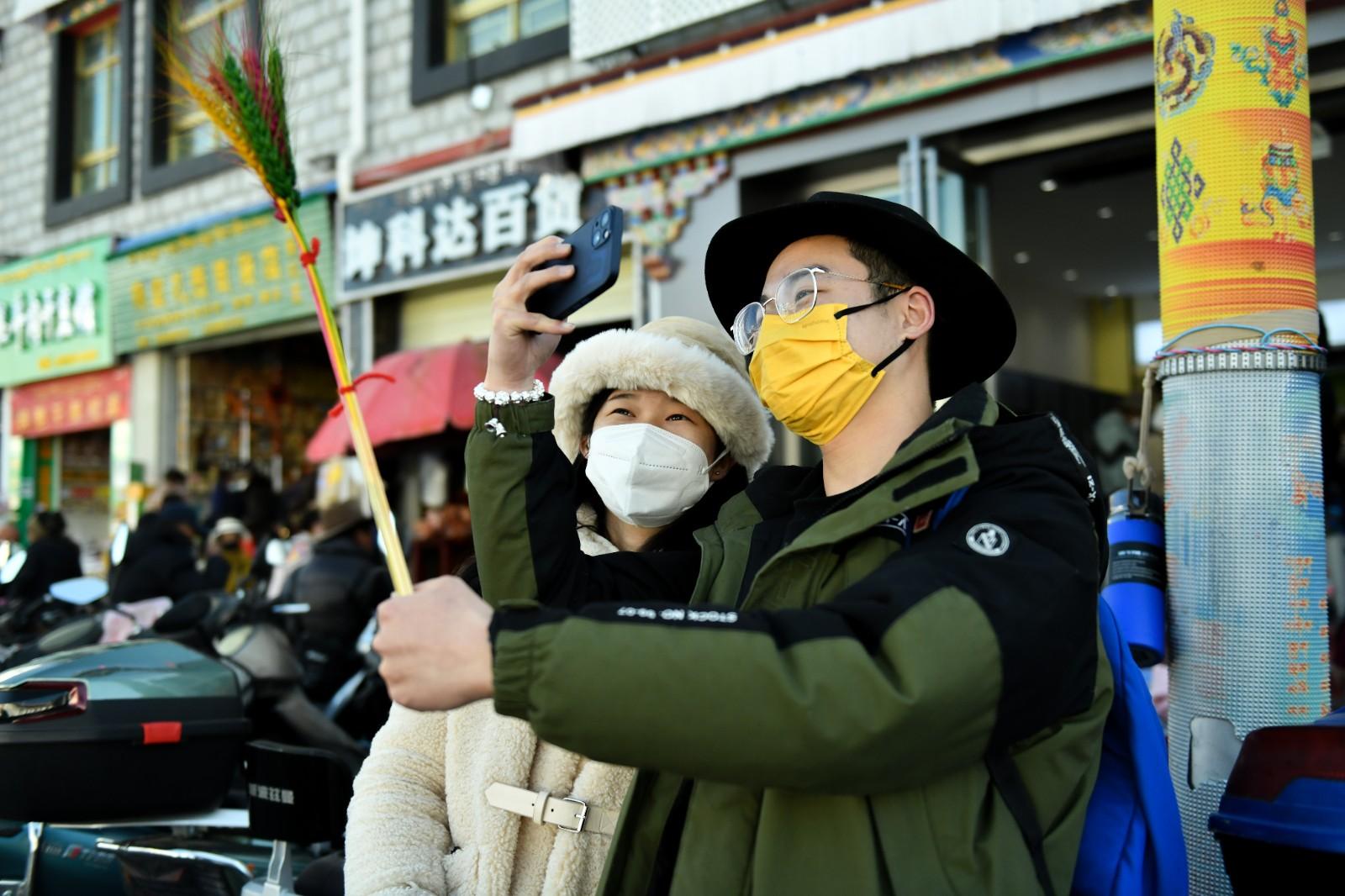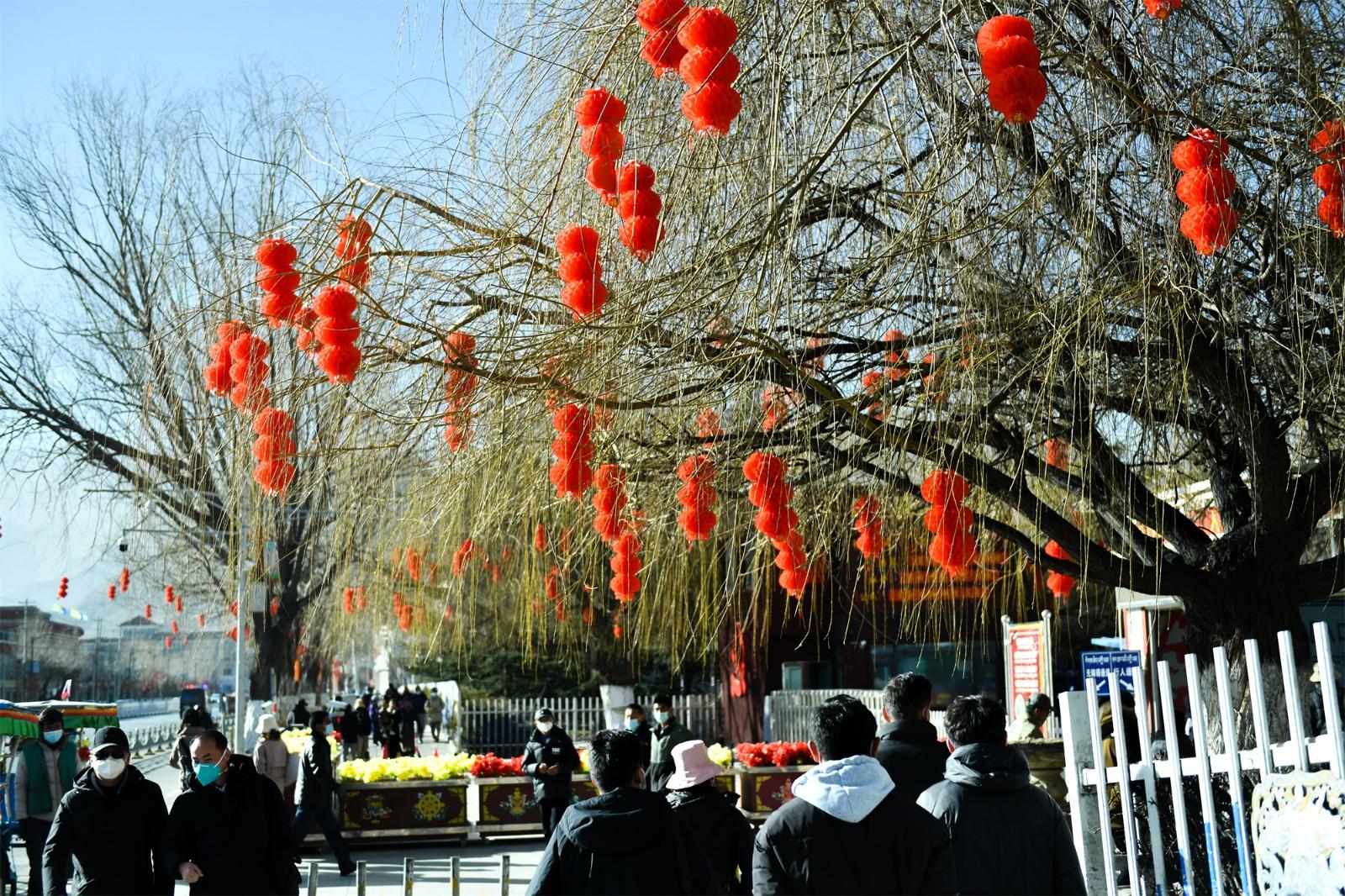 近年来,随着经济的发展,人们的过年方式也在悄然改变,越来越多的人选择利用假期,与家人、朋友去旅游,体验别样的年味。临近2023年藏历水兔年,许多游客趁着“冬游西藏”优惠政策来西藏过年,体验雪域高原冬季呈现的美丽和独特的人文风情。图为来自浙江杭州的游客在拉萨街头感受年货市场的热闹。记者 梁秦 摄