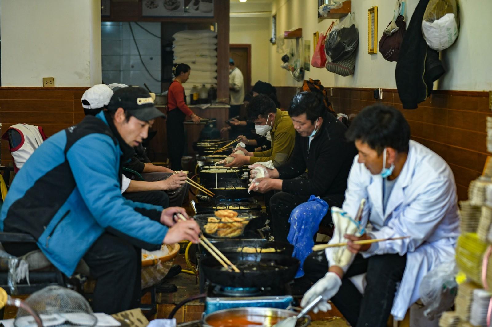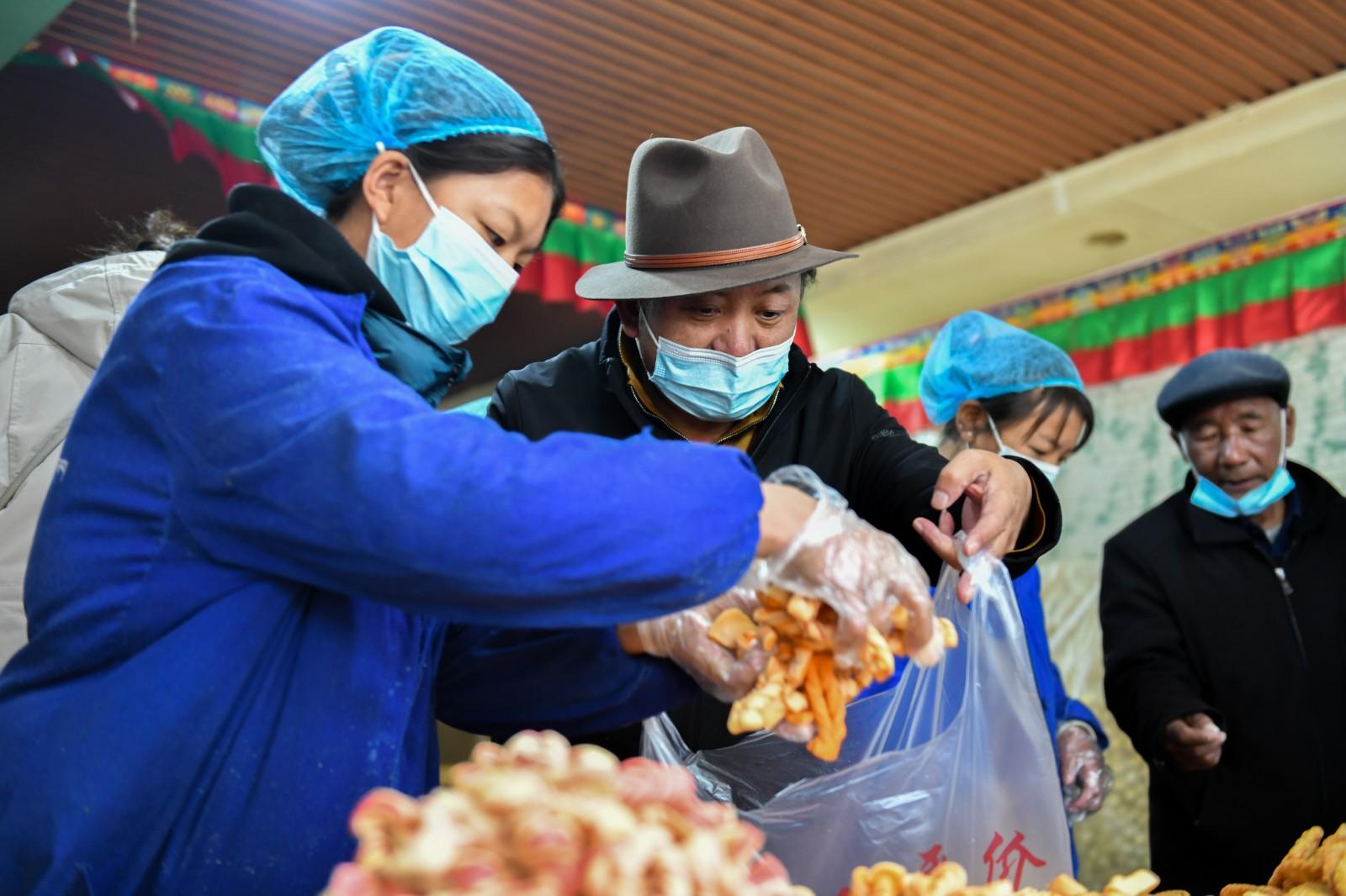 过年时,亲朋好友串门拜年,每家每户都会摆出早已准备好的美食,各式各样的“卡赛”一定是很多人的心头好。“卡赛”是藏历新年的传统食物,是每一个藏族家里必备年货之一。它是一种用酥油炸制,然后再裹上白砂糖,辅以各种颜色的面食。图为一家卖“卡赛”的店铺里排起了购买的长队。记者 梁秦 摄