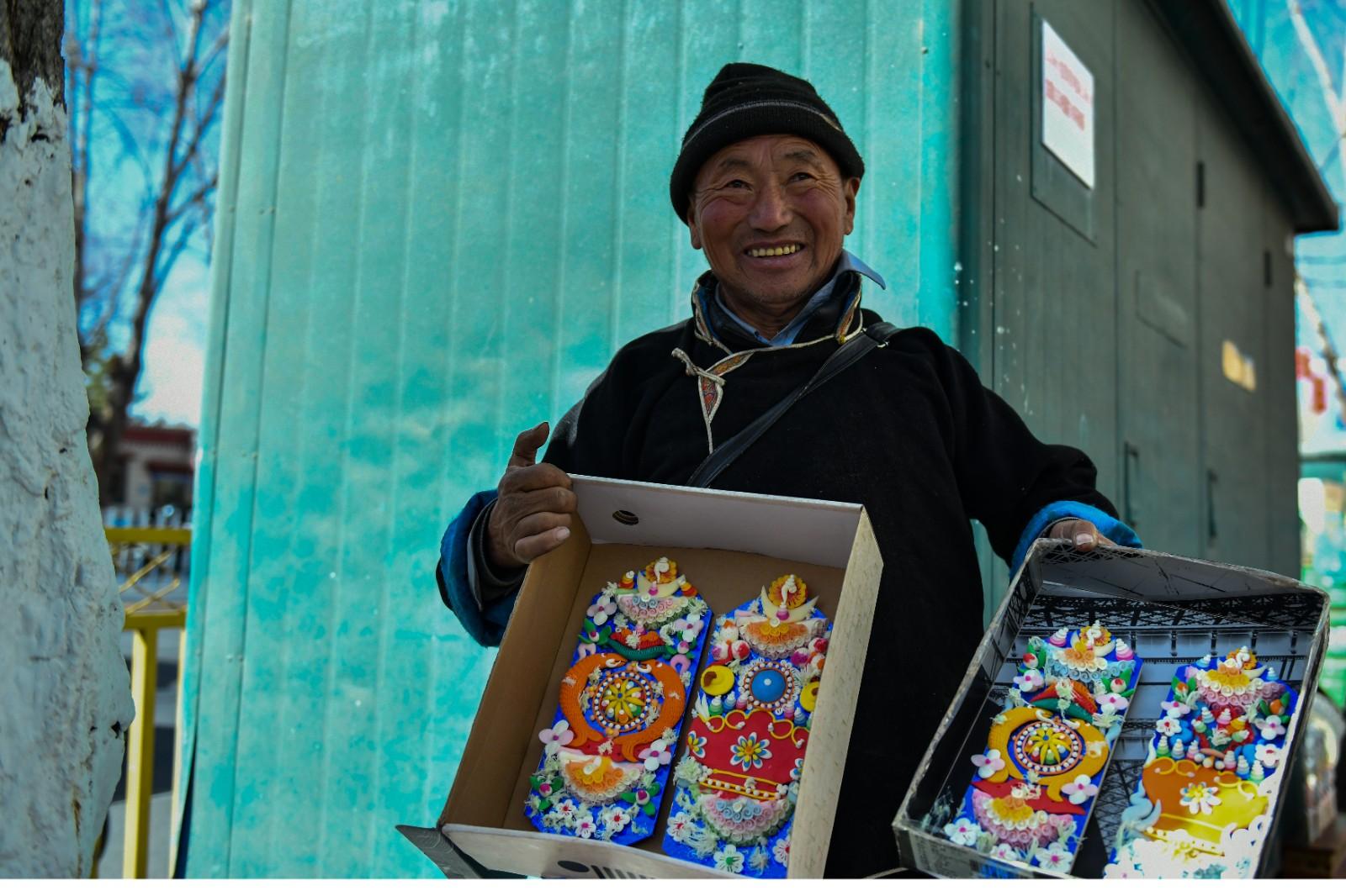 每年购置年货时,酥脆的卡塞和精致的酥油花是每家必选的年货。藏族群众每家每户都要在富有民族特色的切玛盒上精心布置酥油花。酥油花捏制出的每个花鸟、草木象征着人寿年丰、吉祥如意。图为热旦早早来到年货市场,找好阴凉处,刚刚摆放好装着各种酥油花的一排排整齐纸箱,很多市民就前来竞相购买。记者 梁秦 摄