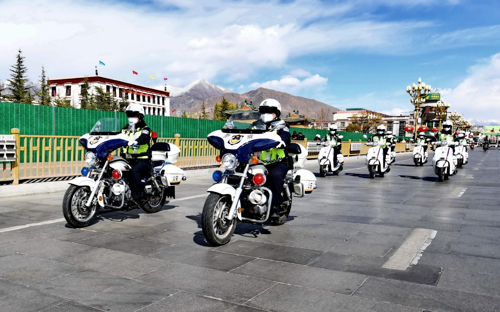 她们以勇往直前的坚定意志、忘我工作的职业操守、无私奉献的高贵品质展现新时代西藏女性的责任与担当,靠实绩赢得了群众的认可与尊重。图为拉萨市公安局交警支队城北大队女子中队的交警正在巡逻。记者 唐斌 摄
