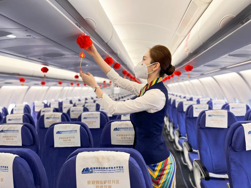 图为正在装饰客舱的藏航空姐。西藏航空供图