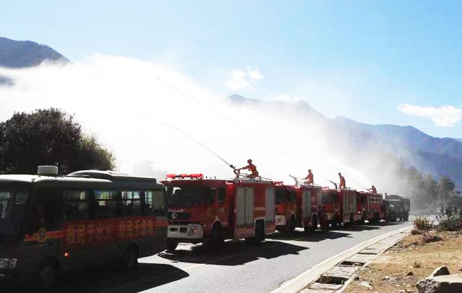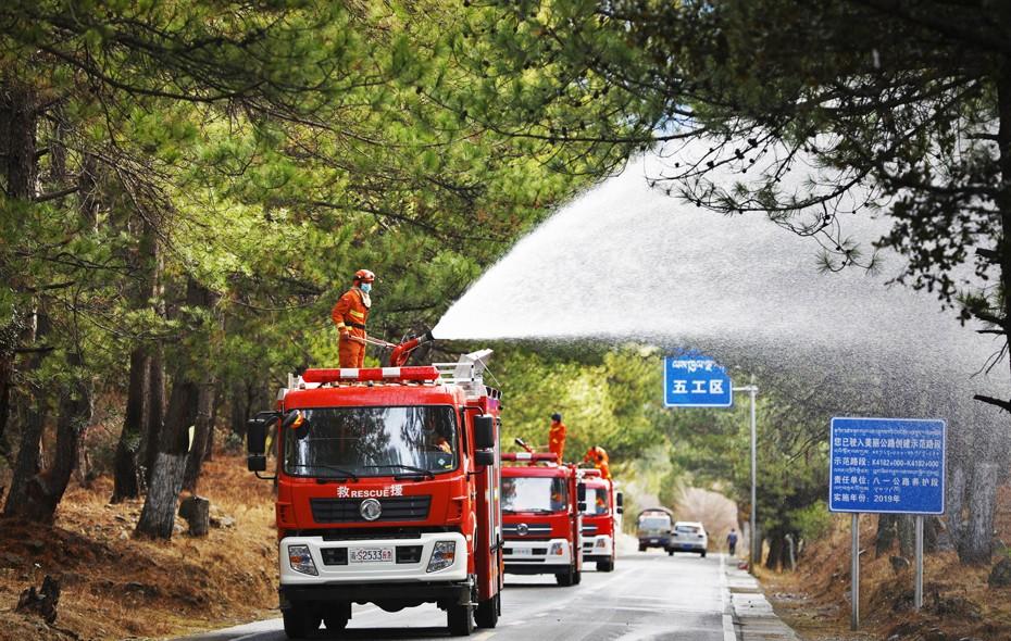 开春以来,林芝市降雨量明显减少,林内枯枝落叶较厚,且正值旅游旺季,游客量持续增长,火灾隐患随之增多,引发山火的可能性较大。图为该支队在重点区域开展洒水增湿作业。记者 张猛 王珊 谢筱纯 摄