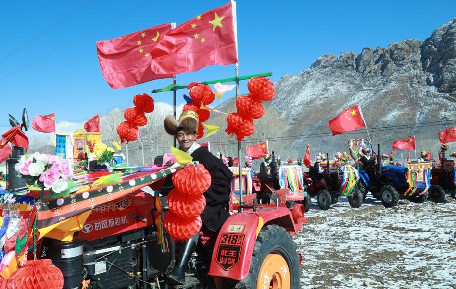 耕作的方式变了,祈福的传统还在。过去系在耕牛身上的五彩哈达和花束,如今披在了拖拉机的车头,牛角上顶着的红缨穗移到了拖拉机的两侧,挂在牛脖子上叮铃作响的铃铛安置在了拖拉机的车头下方,高原春耕的传统形式延续到现代机械化农业中。图为开耕仪式上,山南市乃东区克松社区群众将拖拉机装饰成耕牛模样,一名拖拉机手准备发动机器,开启春耕第一犁。 记者 刘枫 摄