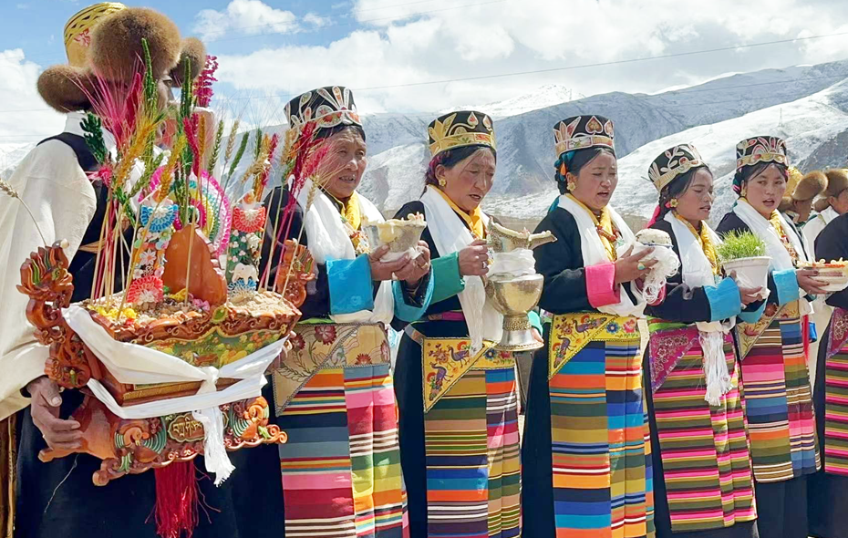 在墨竹工卡县唐加乡莫冲村,村民们身着节日盛装,欢聚在田间地头,开启春耕“第一犁”,抓好春耕备耕,让“希望的田野”更有希望。图为村民们为即将耕种的男女敬献哈达、切玛、青稞酒。记者 格桑伦珠 黄志武 摄