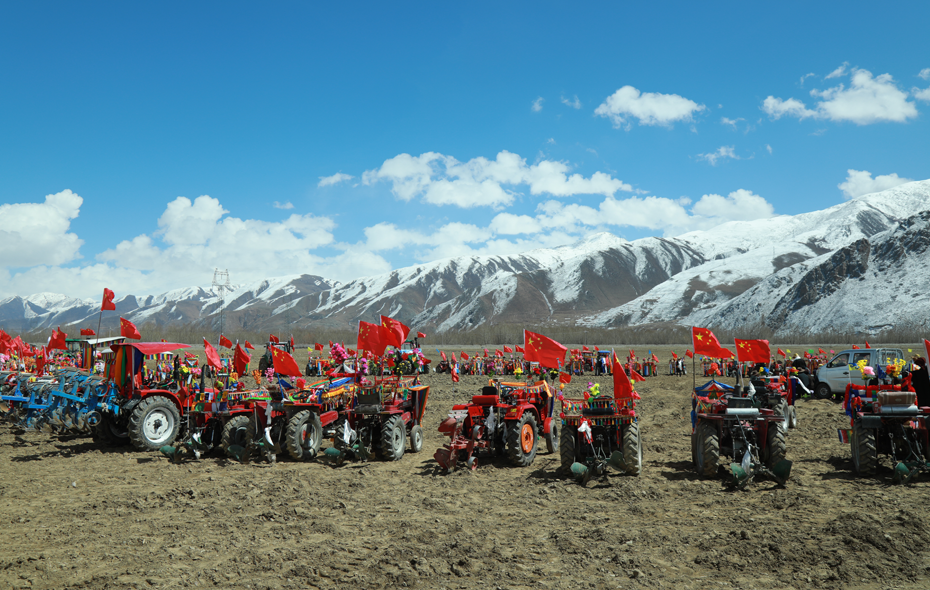 仪式开始时,指挥的人发出号令,数十名妇女有序地撒着种子,早已整装待发的150辆拖拉机排成一条长龙,在田地里开始耕地。图为拉萨市墨竹工卡县唐加乡莫冲村开耕仪式现场。 通讯员 洛克 摄