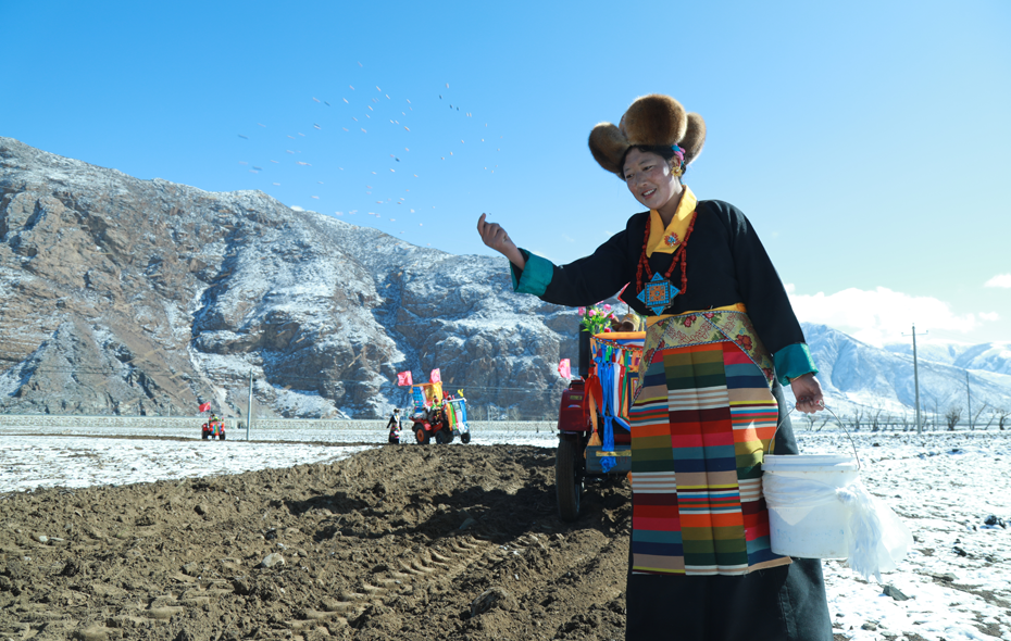 开耕仪式,这个高原农家人代代相传的习俗,如今已然变成西藏农耕文化的一张名片。在这春播时节,农人们把春天的希望和种子一同播进沃土,用智慧和汗水浇灌又一个沉甸甸的丰收年。图为墨竹工卡县莫冲村一位妇女播撒种子。 通讯员 洛克 摄