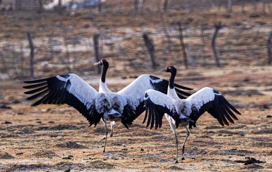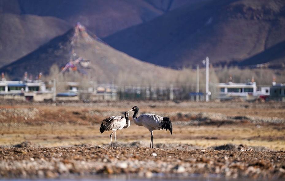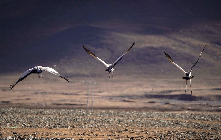 又会于11月中旬从繁殖地那曲的班戈县、申扎县、嘉黎县,阿里的日土县、普兰县,日喀则的昂仁县,拉萨的当雄县返回到越冬地。对于雅江中游河谷来说,它是冬候鸟;对于羌塘北部草原来说,它是夏候鸟。图为拉萨市林周县境内准备向北迁徙的黑颈鹤。记者 阿旺尼玛 摄