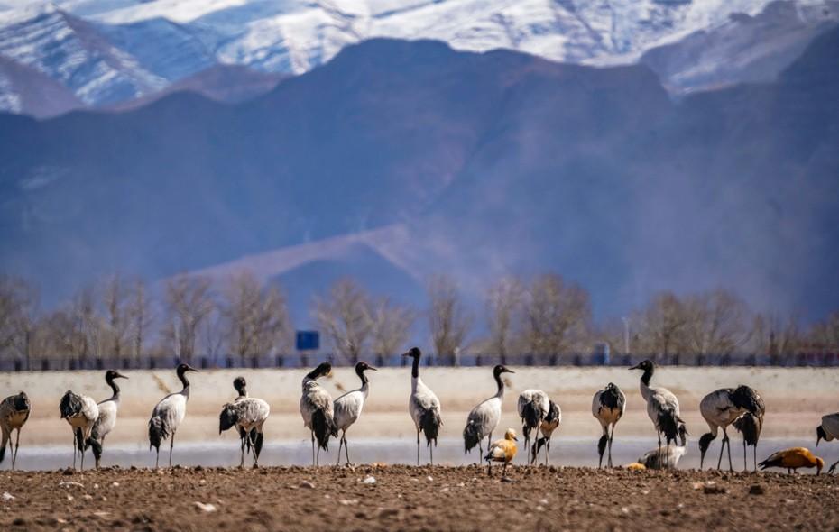 拉萨北部的林周县平均海拔约4200米,是黑颈鹤的主要越冬地之一。最近这段时间,对拉萨市林周县野保员们来说,一边要忙自家的农活,一边还要巡查候鸟情况。图为拉萨市林周县境内准备向北迁徙的黑颈鹤。记者 阿旺尼玛 摄