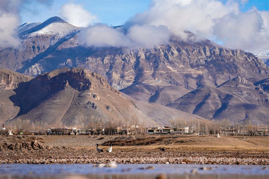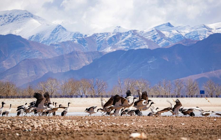 整体来说,是从雅鲁藏布江中游河谷黑颈鹤国家级自然保护区飞往色林措黑颈鹤保护区,两个保护区之间有一条固定的黑颈鹤迁徙路线。图为拉萨市林周县境内准备向北迁徙的黑颈鹤。记者 阿旺尼玛 摄
