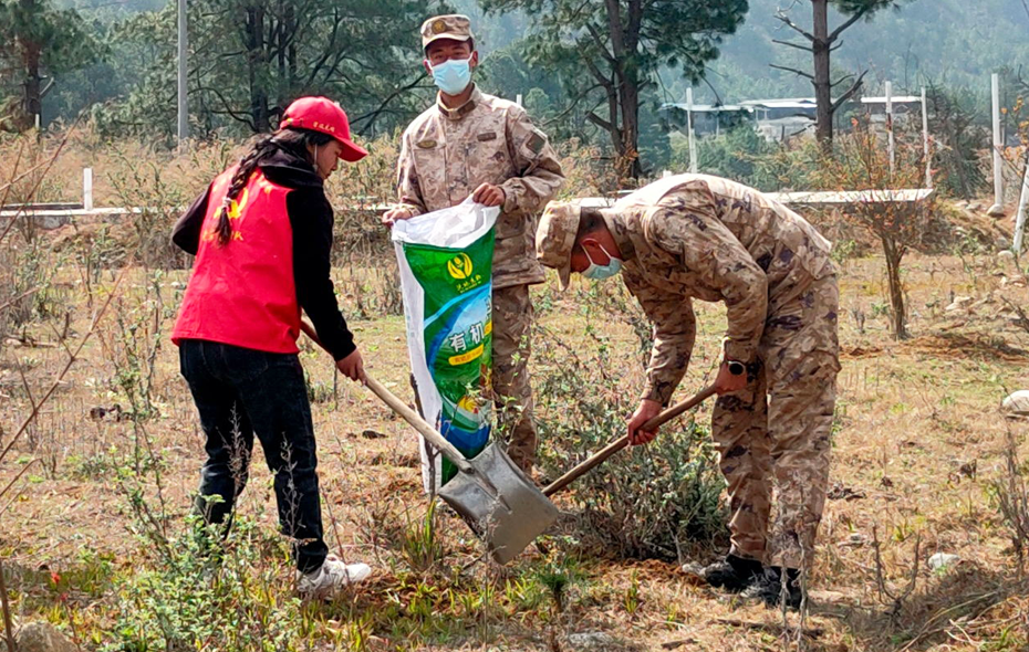 在整个布巴村的公共空地上,到处都是军地学雷锋志愿服务队忙碌的身影,有的拿着扫把打扫卫生,有的捡起角落丢弃的垃圾。“车里装着石头,咱们俩一起推”“这个袋子比较重,让我来背。”在军地双方携手努力下,布巴村的环境焕然一新。图为官兵和党员群众为石榴树施肥。记者 谢筱纯 王珊 张猛 摄