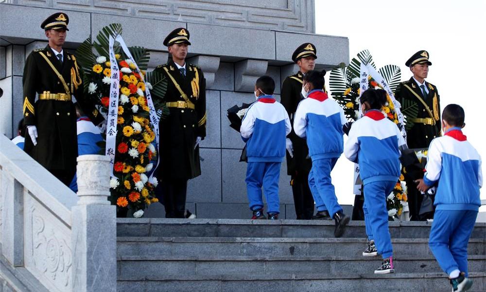 连日来,我区各地各单位开展多种形式纪念活动,缅怀革命先烈,弘扬英雄精神,用党的光荣传统和优良作风坚定信念、凝聚力量。图为拉萨市少先队员们怀着崇高的敬意,在拉萨烈士陵园祭奠革命先烈。 邢梦雨 记者 耿锐仙 摄