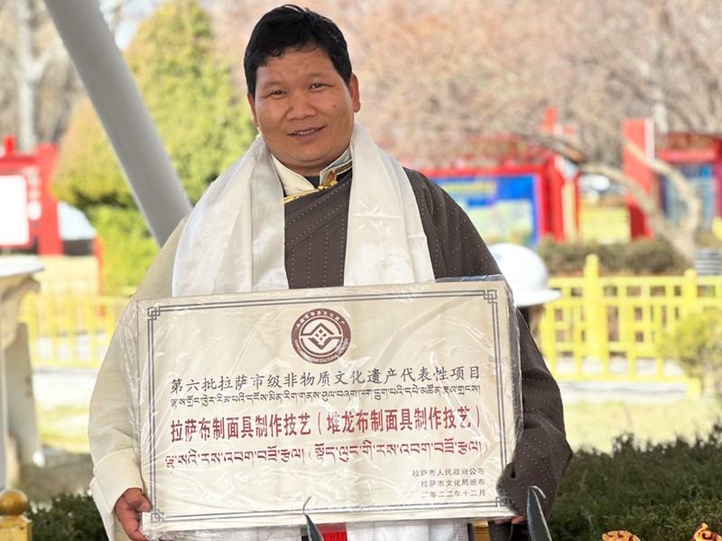 传统面具至今都是靠手艺人一笔一画制作出来的,无法被现有的机器所代替,而“它”的生产、保护、延续和再创作都需要更多有毅力的传统手艺人。作为已经被认可的非遗传承人,罗桑巴珠这个“守”艺人希望通过自己的努力让布塑面具的制作技艺被更多人看见并喜爱。图为2022年,堆龙布制面具制作技艺被评为第六批拉萨市级非物质文化遗产代表性项目,罗桑巴珠欣喜拍照留念。