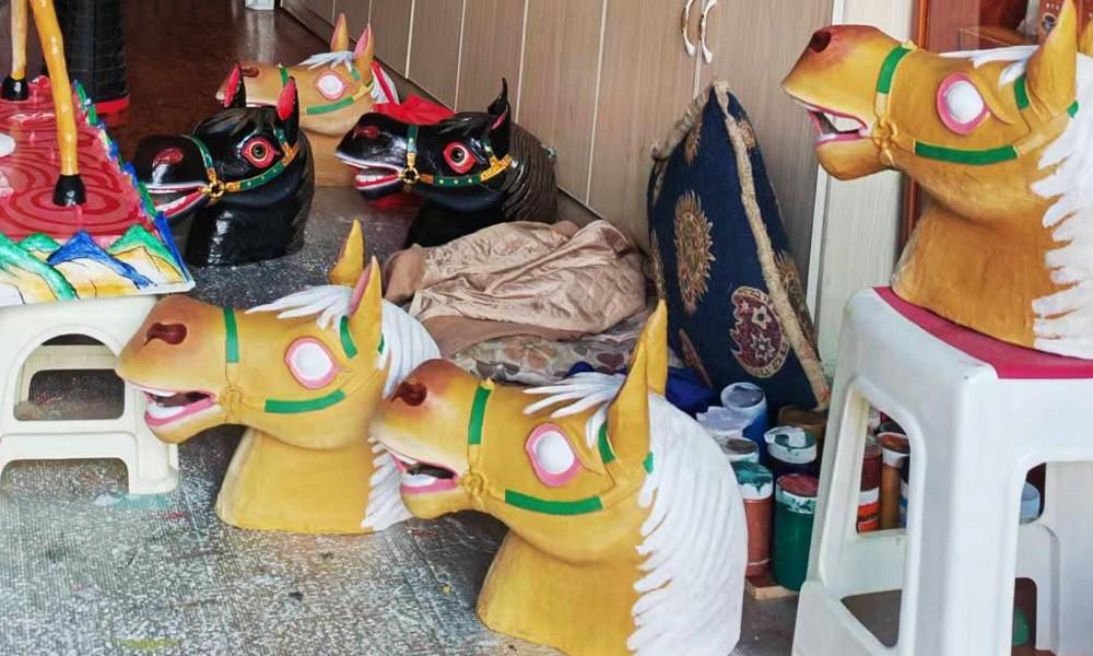 走进拉萨市堆龙德庆区的一处藏式院落,罗桑巴珠手拿画笔蘸取颜料,正聚精会神地制作传统藏戏面具。不远处,徒弟欧珠用和好的泥塑造出了一个面具的雏形。图为罗桑巴珠在制作传统藏戏面具(马头)。