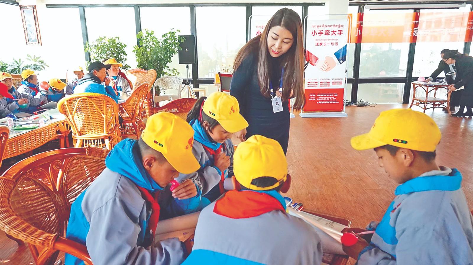 2015年,德庆玉珍怀揣梦想返回西藏,与北大的同学一道,创立拉萨海雕视角教育咨询公司,专注于教育创新和教育发展,并且期望能够以社会企业的模式以及教育创新的思维为西藏困境儿童及青少年提供支持。那时,“公益创业”在西藏还是一个新鲜概念,但她和团队成员一路坚持了下来。图为德庆玉珍到学校给孩子们上课。