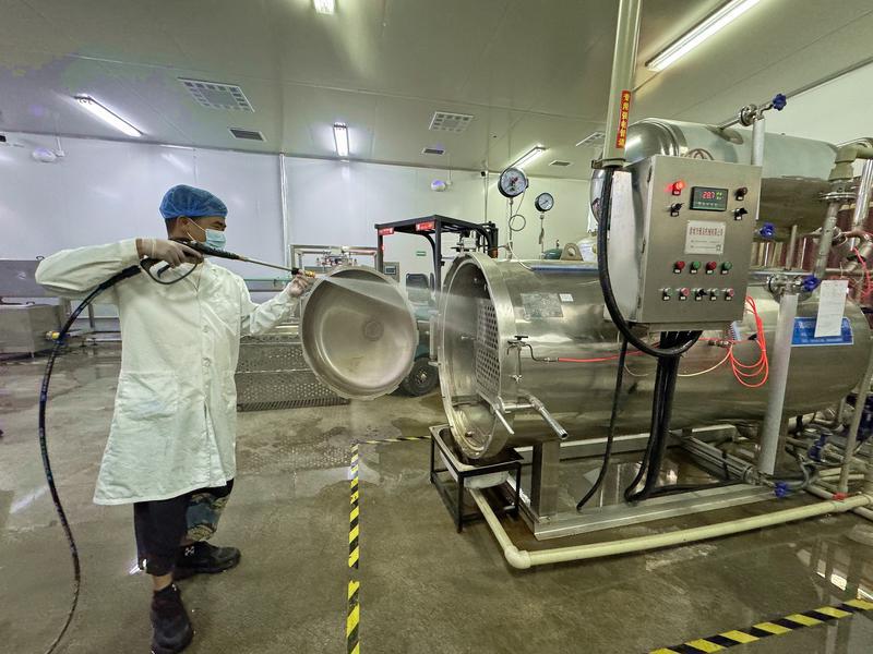 图为:工布江达县产业园沃野实业有限公司的员工正在清洗罐头加工车间。本网记者 白玛泽旺 次仁平措 摄