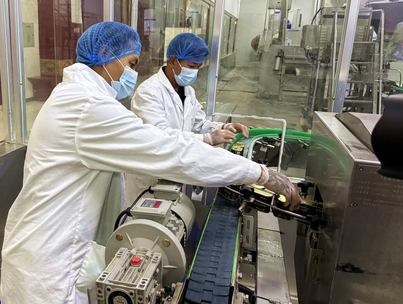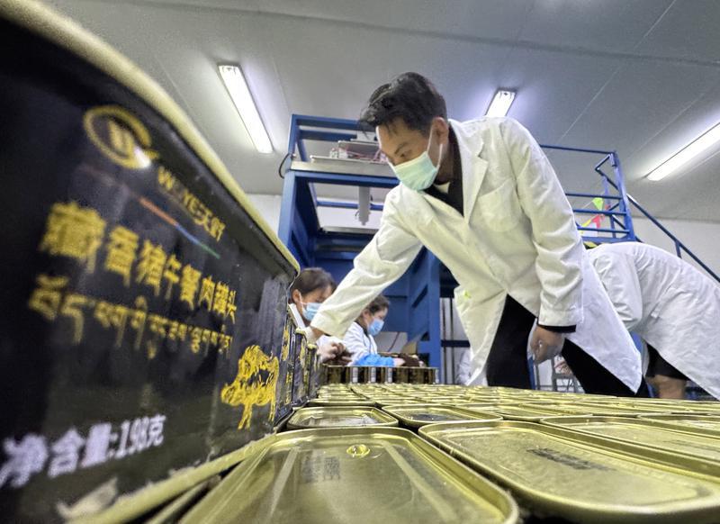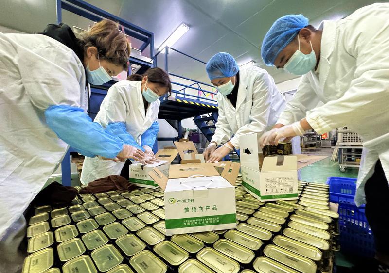 图为:该产业园区内的沃野实业有限公司的员工正在对加工好的藏香猪罐头进行分类打包。本网记者 白玛泽旺 次仁平措 摄