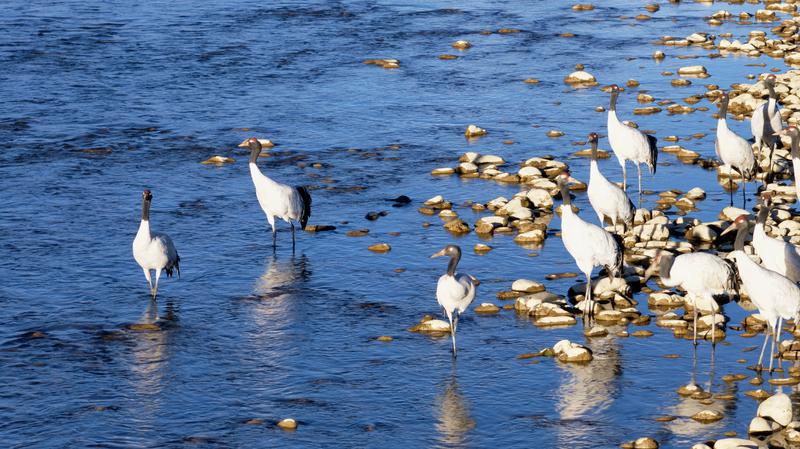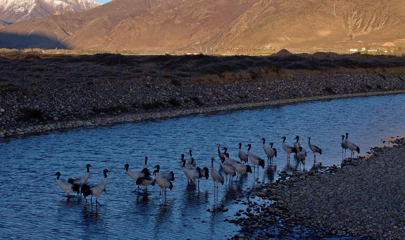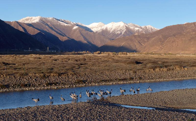 初冬的墨竹工卡县唐加乡,收割后的青稞田铺展成金色地毯,拉萨河畔的浅滩在晨光中泛着银波。几十只黑颈鹤如约而至,它们或低头啄食田间的残茬,或展翅掠过河面,身姿优雅如诗。黑颈鹤的翩跹身影,为雪域高原的寒冬添了一抹灵动的生机。