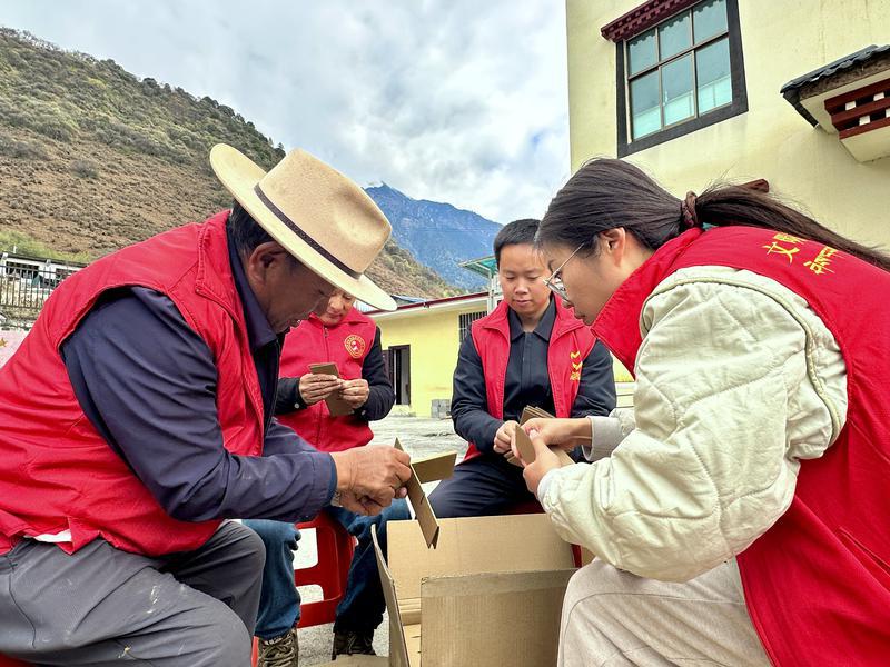 图为墨脱县格当乡党员干部正在帮助村民制作包装盒。本网记者 王敏 通讯员 郎玲 摄